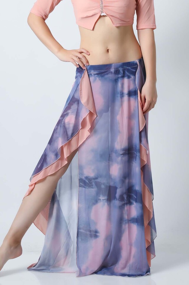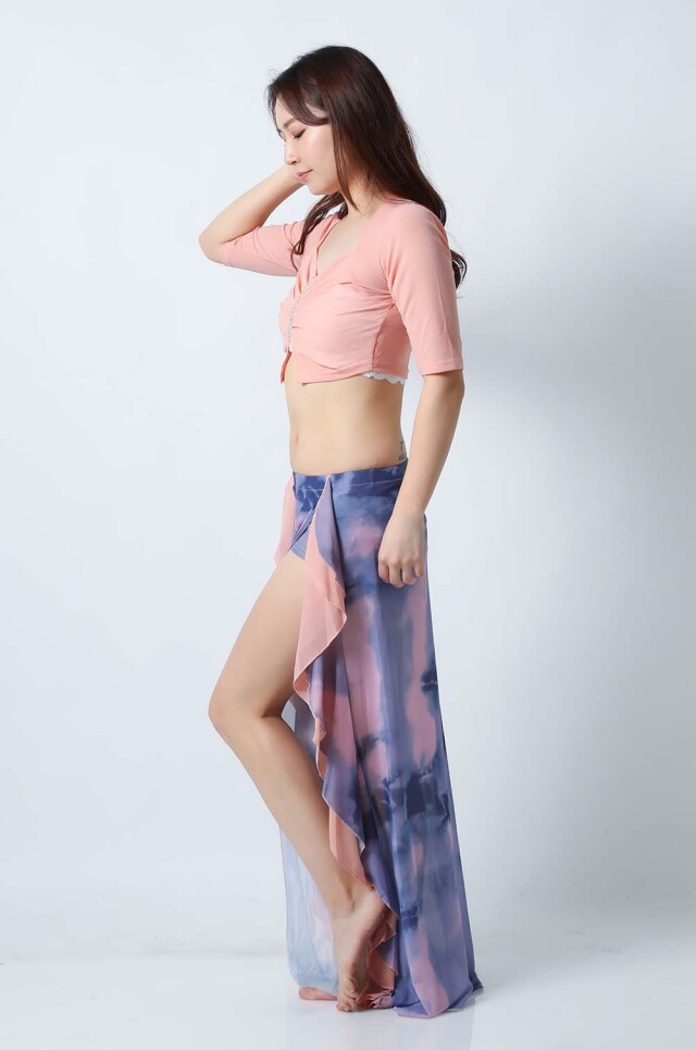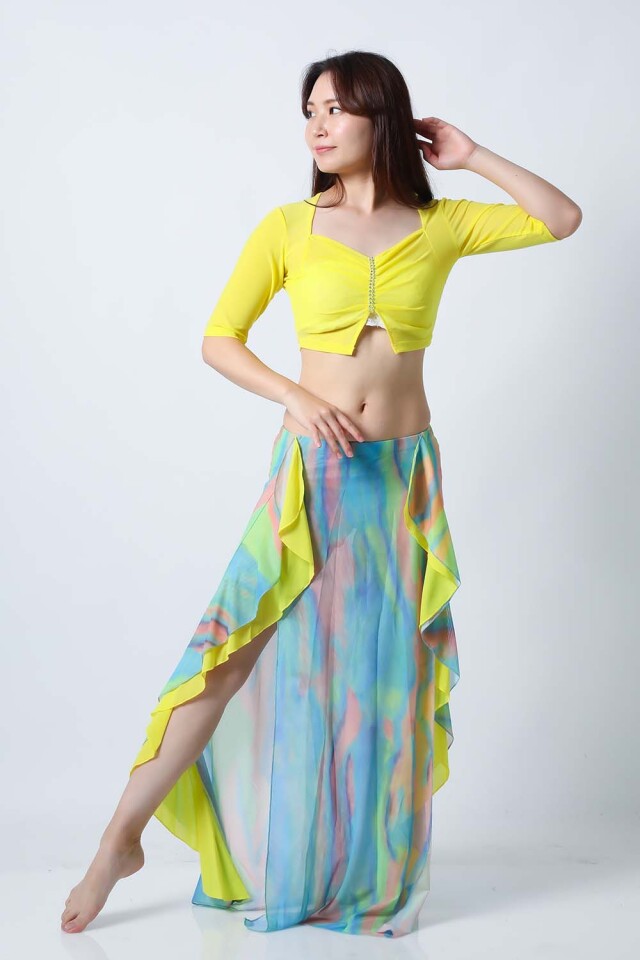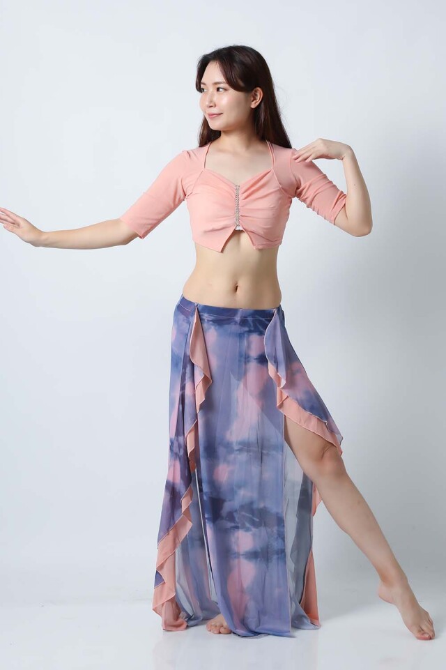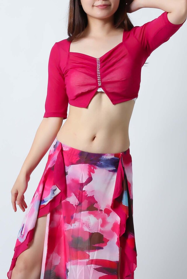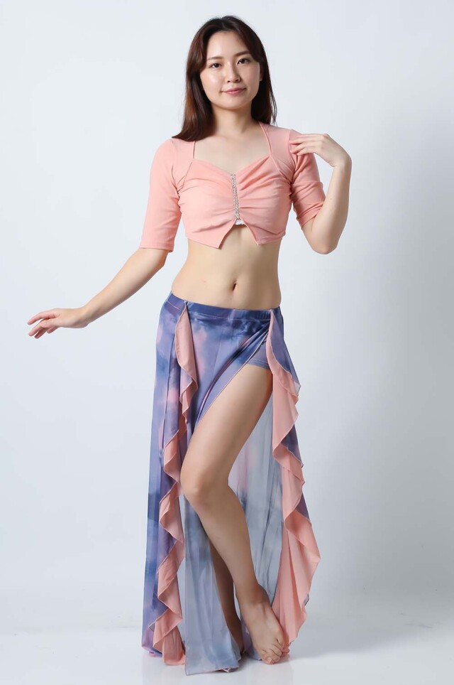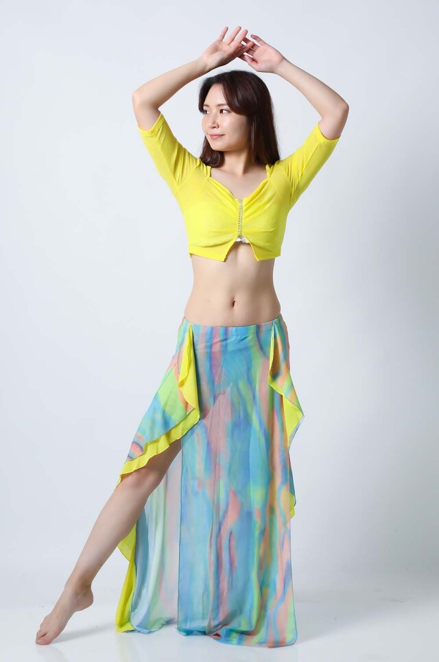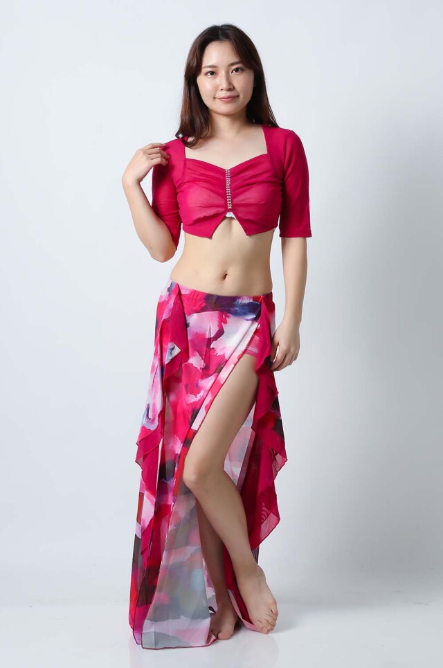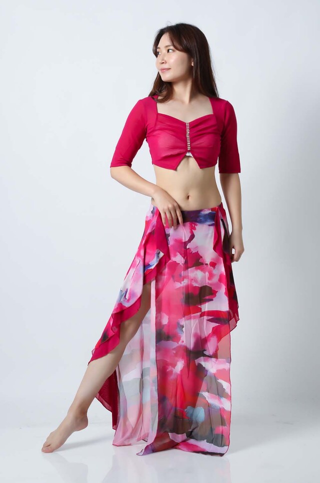 ベリーダンスレッスン用のトップスとスカートの3点セットです。無地のトップスとプリント柄のスカートとの組み合わせがお洒落です。さらっとした生地ですので軽くて踊りやすいです。色によりスカートの柄も異なるので色違いで集めてもそれぞれ楽しめます。セットで着るのも良いし、片方だけ違うウエアと組み合わせることもできます。スカートはインナーショーツが縫い付けられているので安心して踊れます。