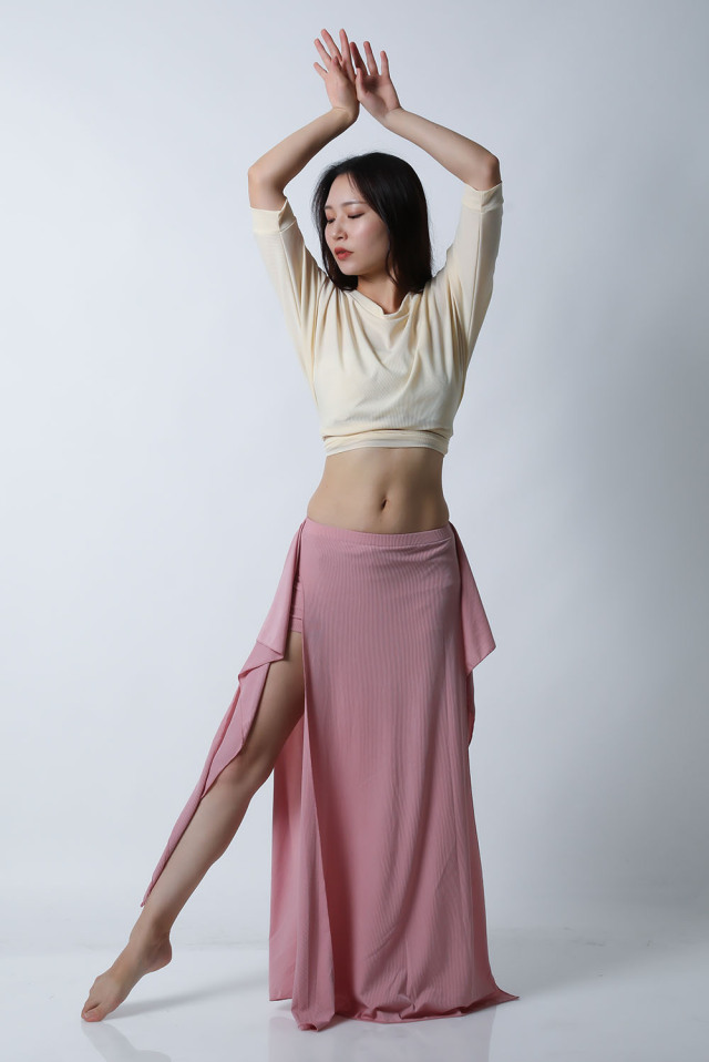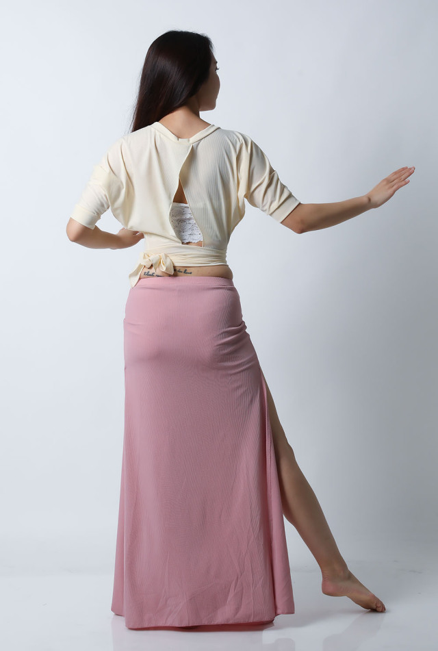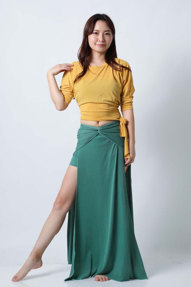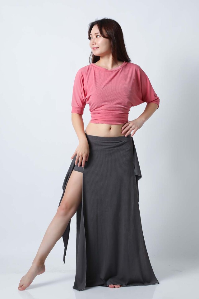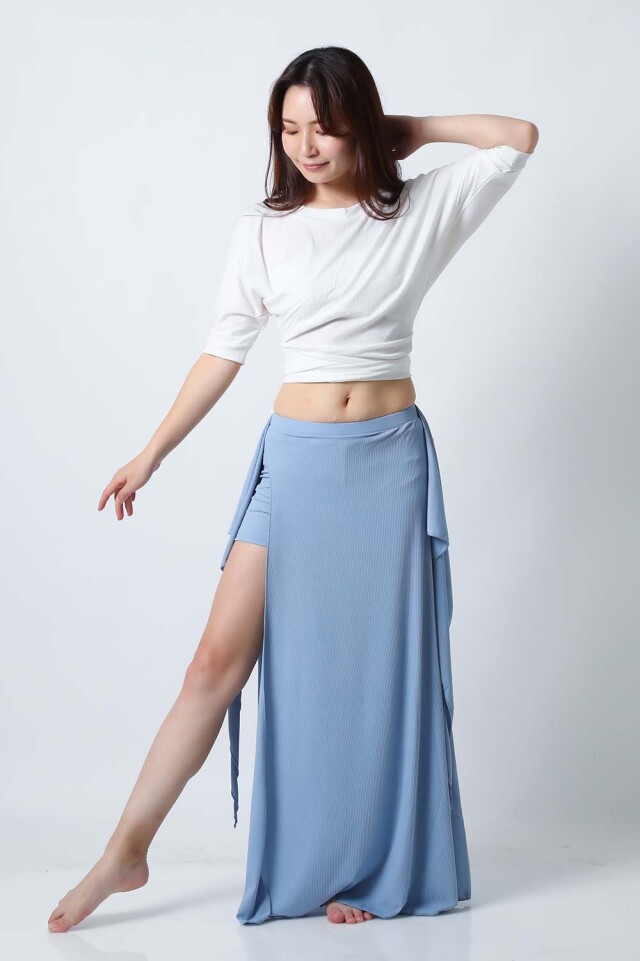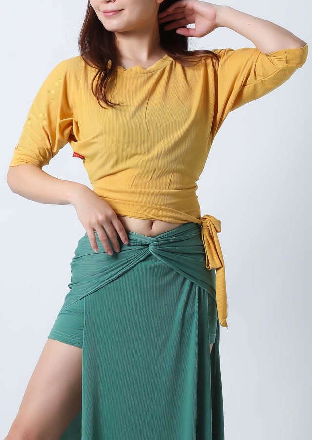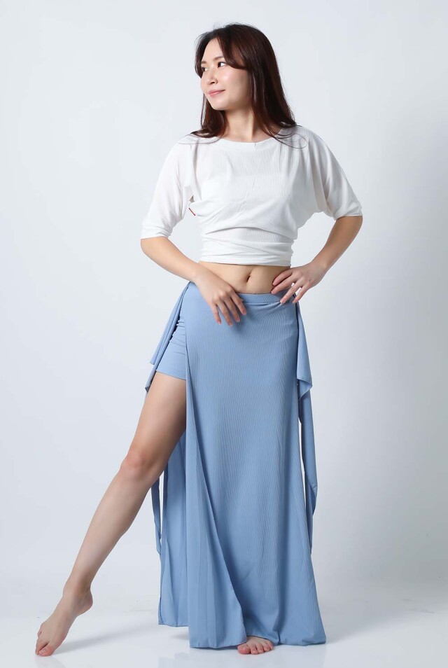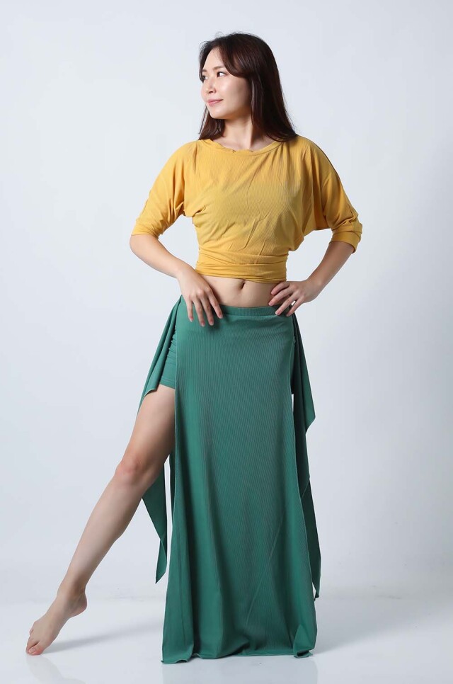 ベリーダンスレッスン用のトップスとスカート、インナーショーツの3点セットです。トップスはドルマンスリーブで動きやすいです。トップスの着丈は少し長めですのでお腹をさりげなくカバーできます。スカートは両サイドにフリルがついており前でクロスしたり、後ろで結んだり、そのままにしたりバリエーション楽しめます。トップスとスカートの色が異なりますので、いかにも合わせましたという感じではなく自然にコーディネートした感じになります。セットで着るのも良いし、片方だけ違うウエアと組み合わせることもできます。インナーショーツもセットに含まれていますのでお買い得です。