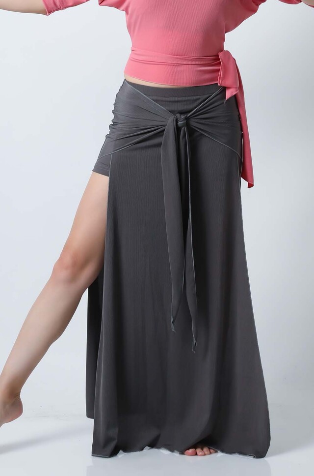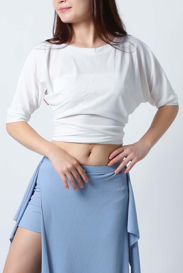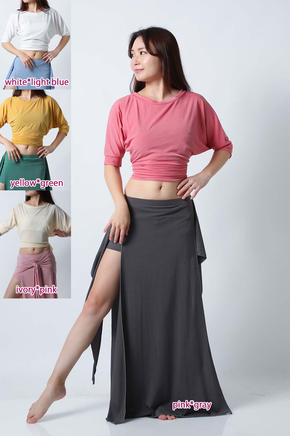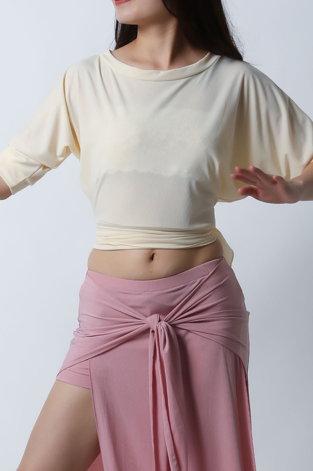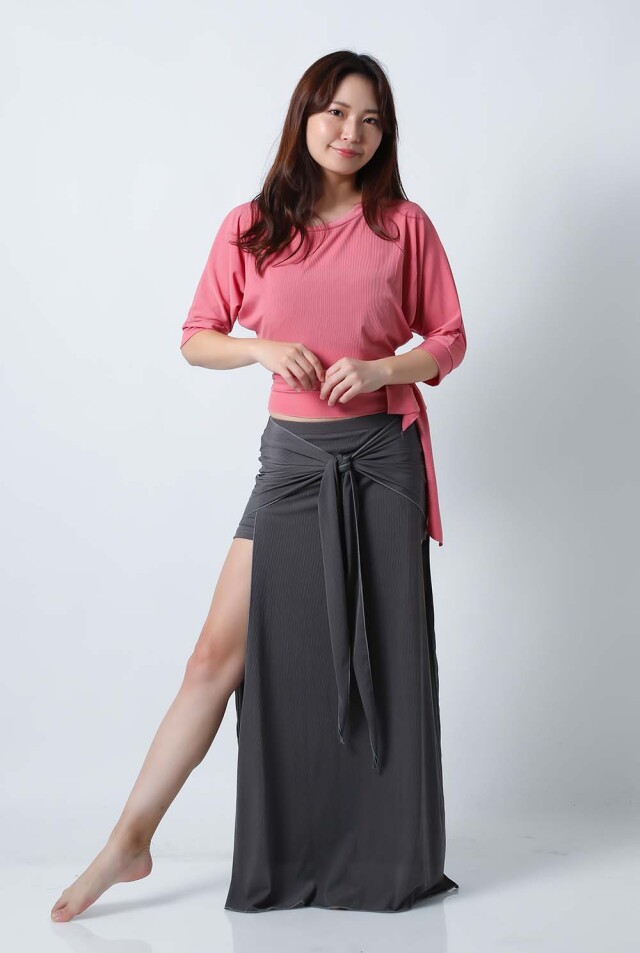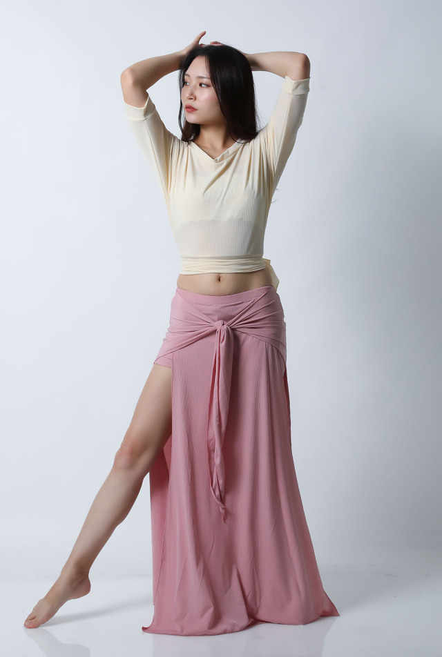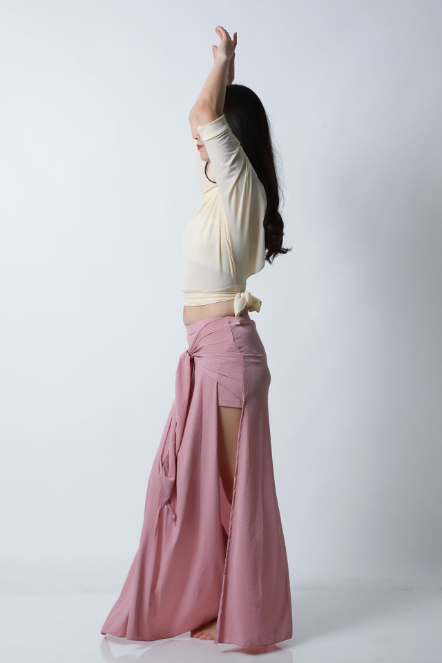 ベリーダンスレッスン用のトップスとスカート、インナーショーツの3点セットです。トップスはドルマンスリーブで動きやすいです。トップスの着丈は少し長めですのでお腹をさりげなくカバーできます。スカートは両サイドにフリルがついており前でクロスしたり、後ろで結んだり、そのままにしたりバリエーション楽しめます。トップスとスカートの色が異なりますので、いかにも合わせましたという感じではなく自然にコーディネートした感じになります。セットで着るのも良いし、片方だけ違うウエアと組み合わせることもできます。インナーショーツもセットに含まれていますのでお買い得です。