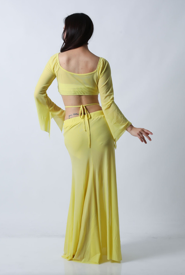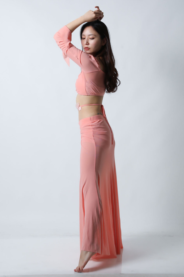 ベリーダンスレッスン用のトップスとスカートの2点セットです。トップスとスカートにバタフライのモチーフが付いているレッスン着です。明るいパステルカラーの生地を使用しているためバタフライがアクセントになり視線を集中させるため膨張せず着こなせます。さらっとした生地で軽くて動きやすいです。スカートは切りっぱなしですので長い場合はお客様自身で裾をカットして調整できます。インナーショーツも縫い付けられていますので安心です。