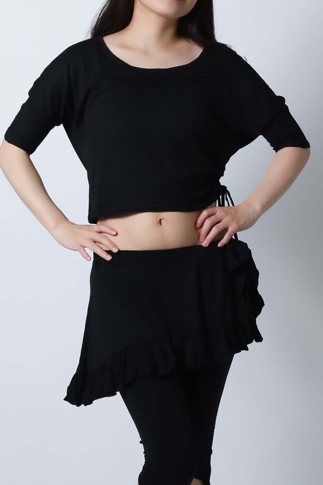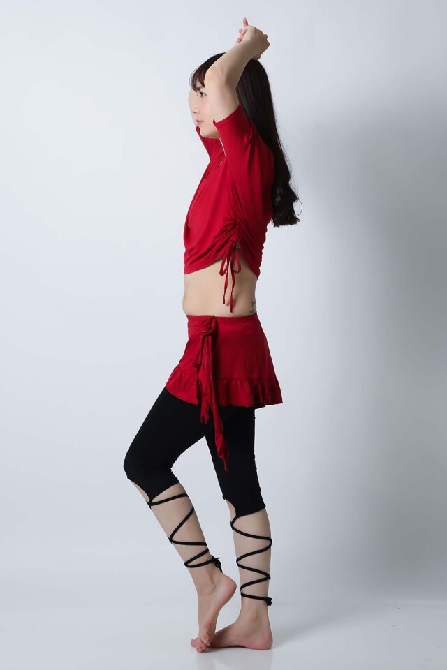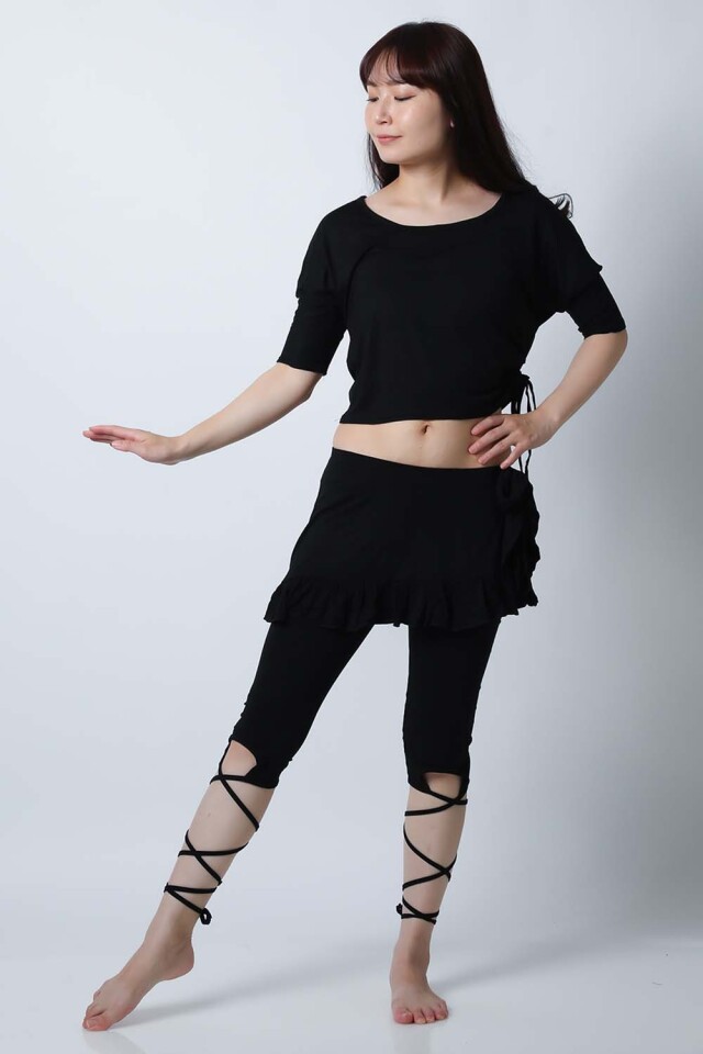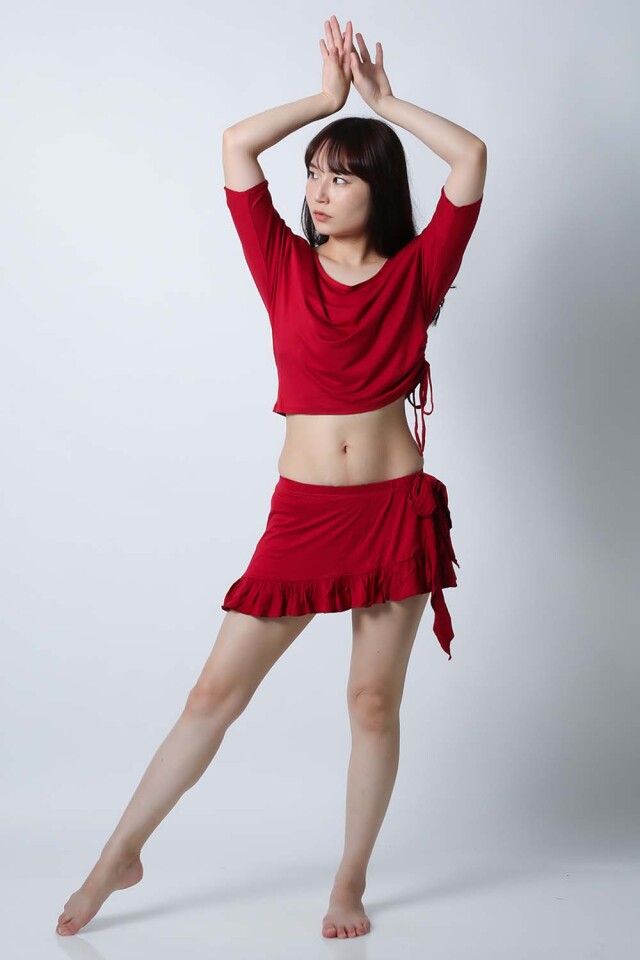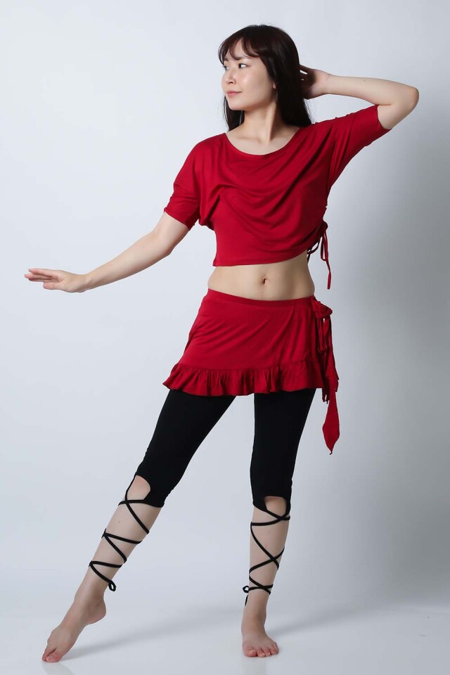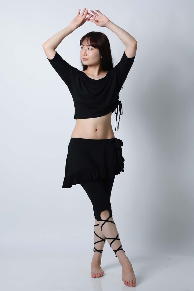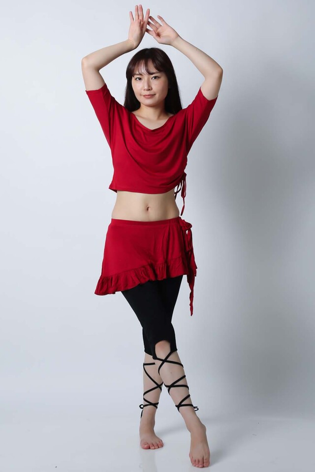 ベリーダンスレッスン用のトップス、スカート、インナーショーツの3点セットです。トップスはドルマンスリーブですので脇下がゆったりしており動きやすいです。スカートはインナーショーツとは別々ですので下にレギンスを着用したり、25ヤードスカートの上に着用したり着回し自由です。