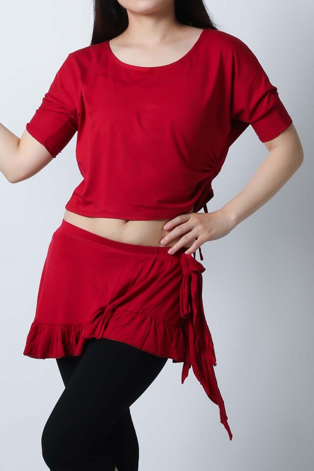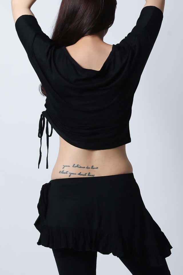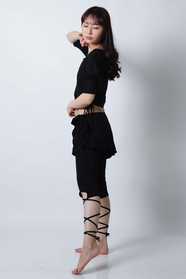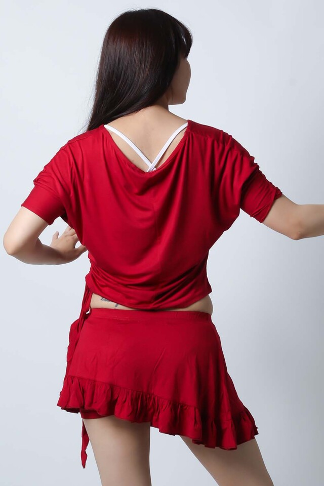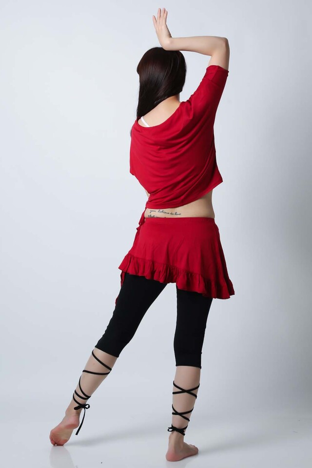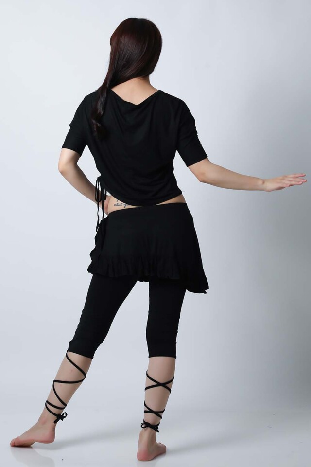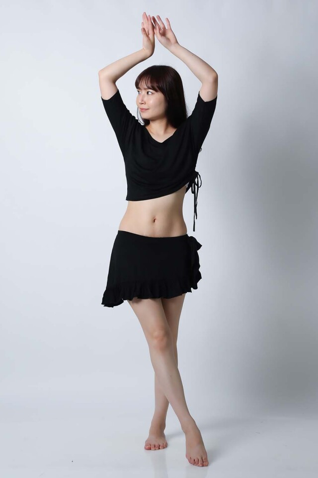 ベリーダンスレッスン用のトップス、スカート、インナーショーツの3点セットです。トップスはドルマンスリーブですので脇下がゆったりしており動きやすいです。スカートはインナーショーツとは別々ですので下にレギンスを着用したり、25ヤードスカートの上に着用したり着回し自由です。