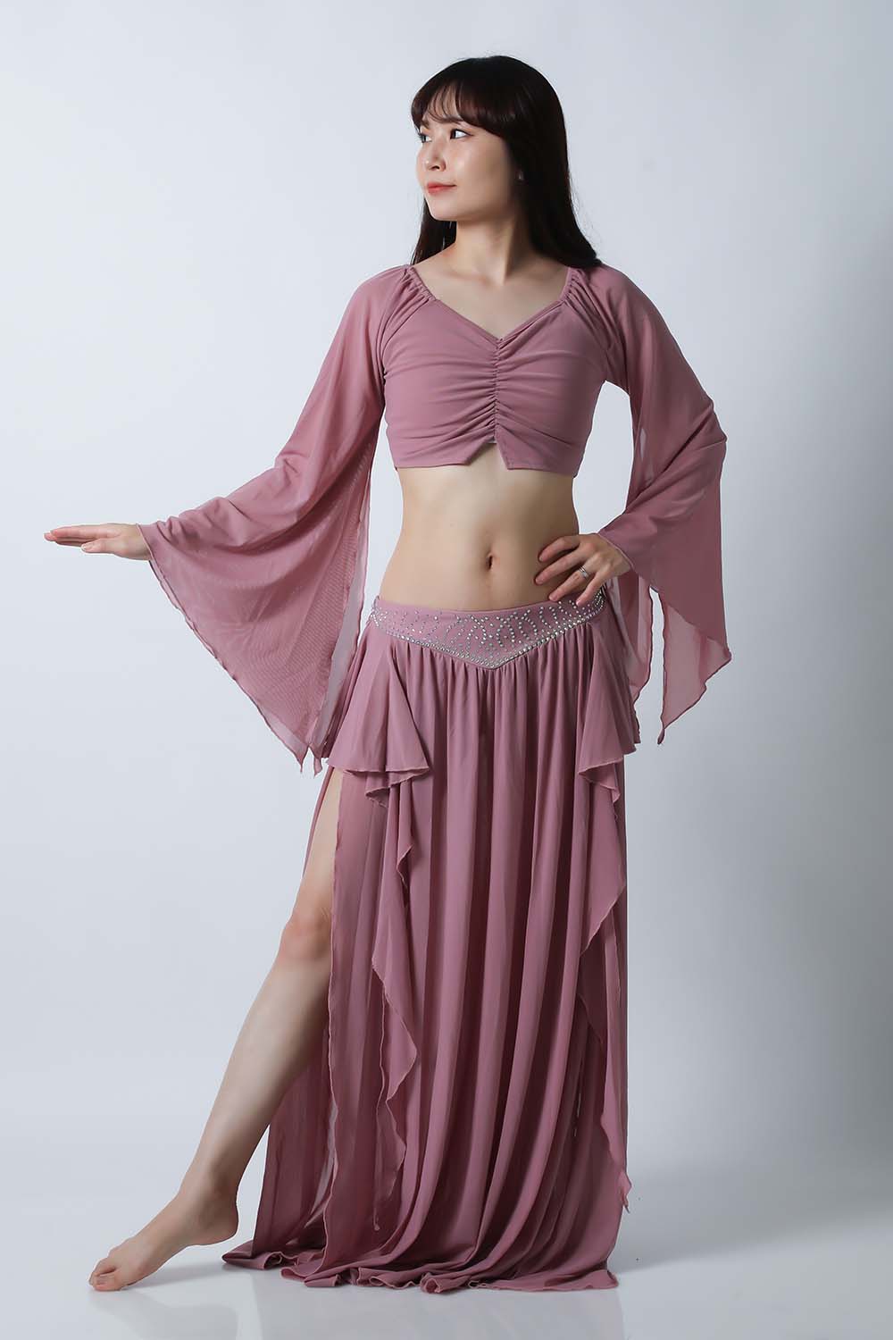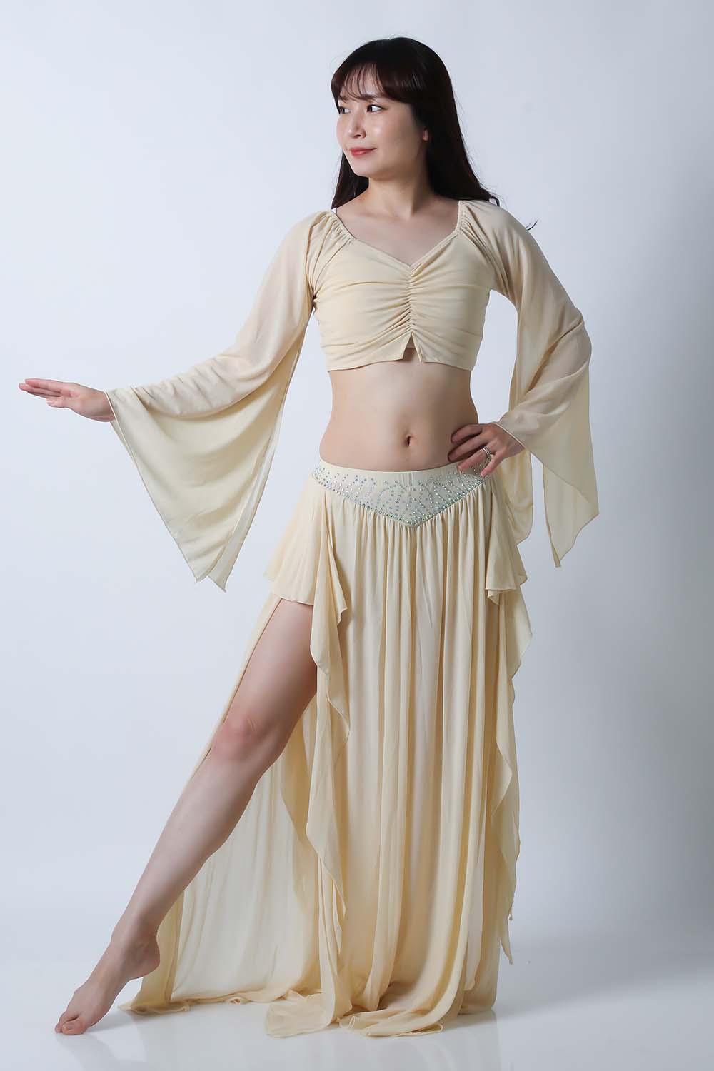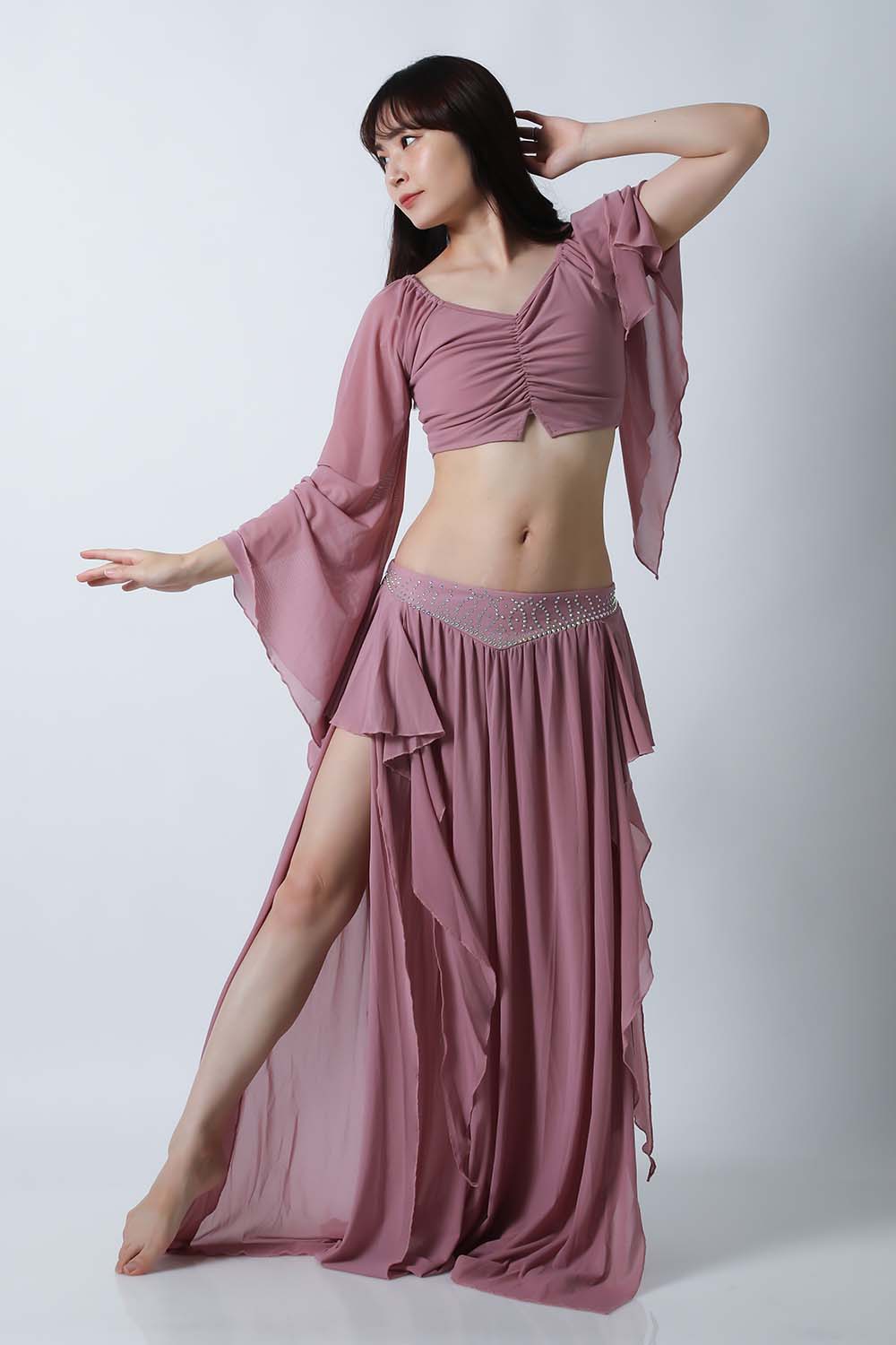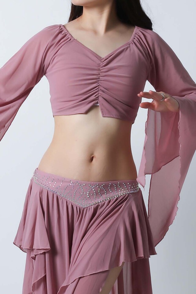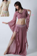 ベリーダンスレッスン用のトップス、スカートの2点セットです。微妙な色合いで、繊細な雰囲気を演出する色の生地を使用しています。トップスは袖幅が広く優雅な動きに魅せてくれます。スカートはフレアタイプで上品なイメージを演出してくれます。インナーショーツが縫い付けられていますので安心です。