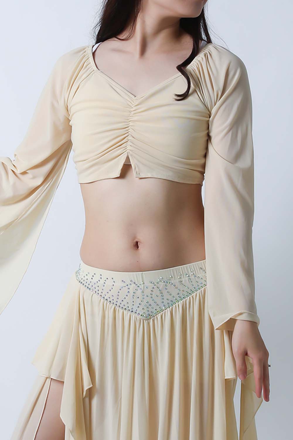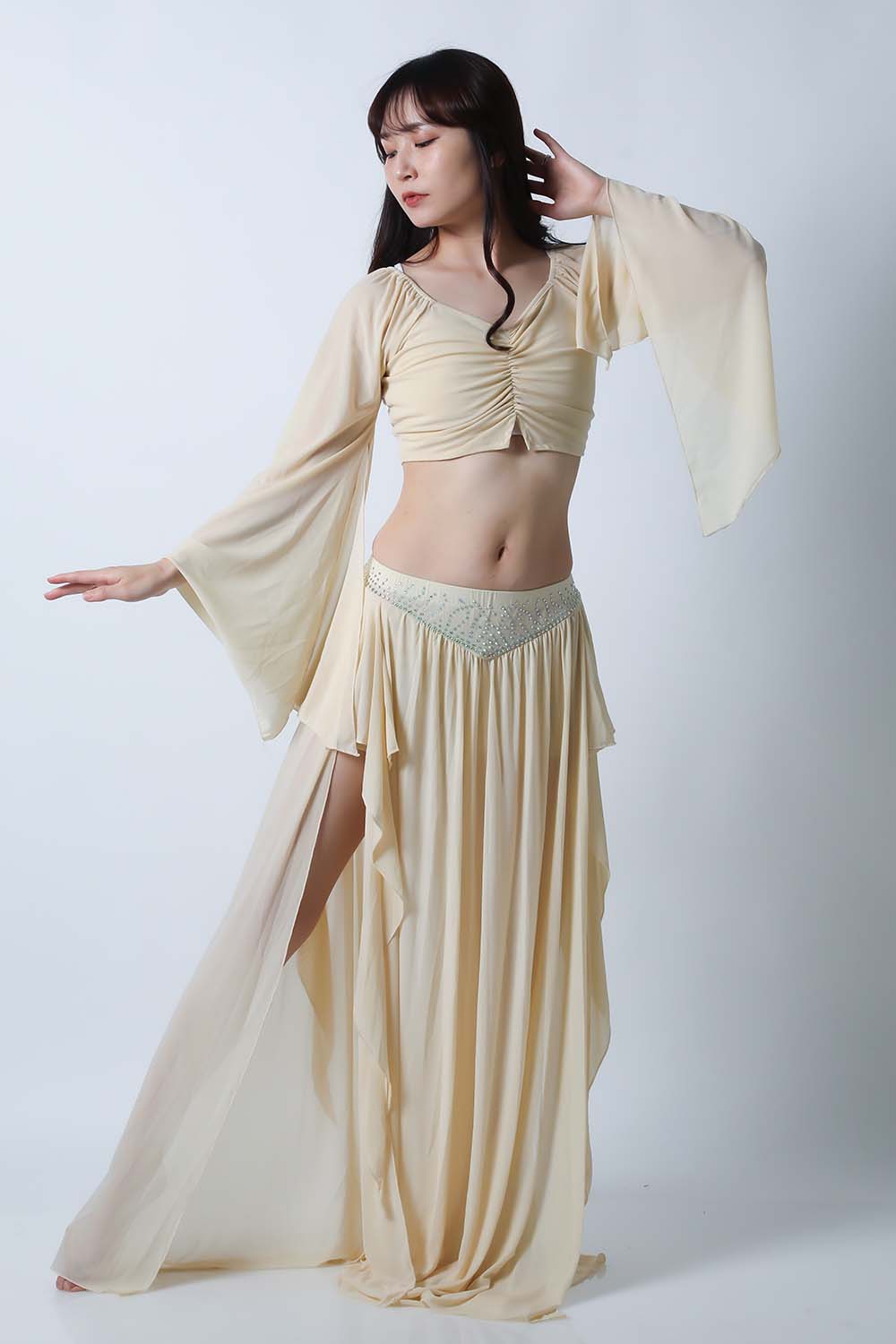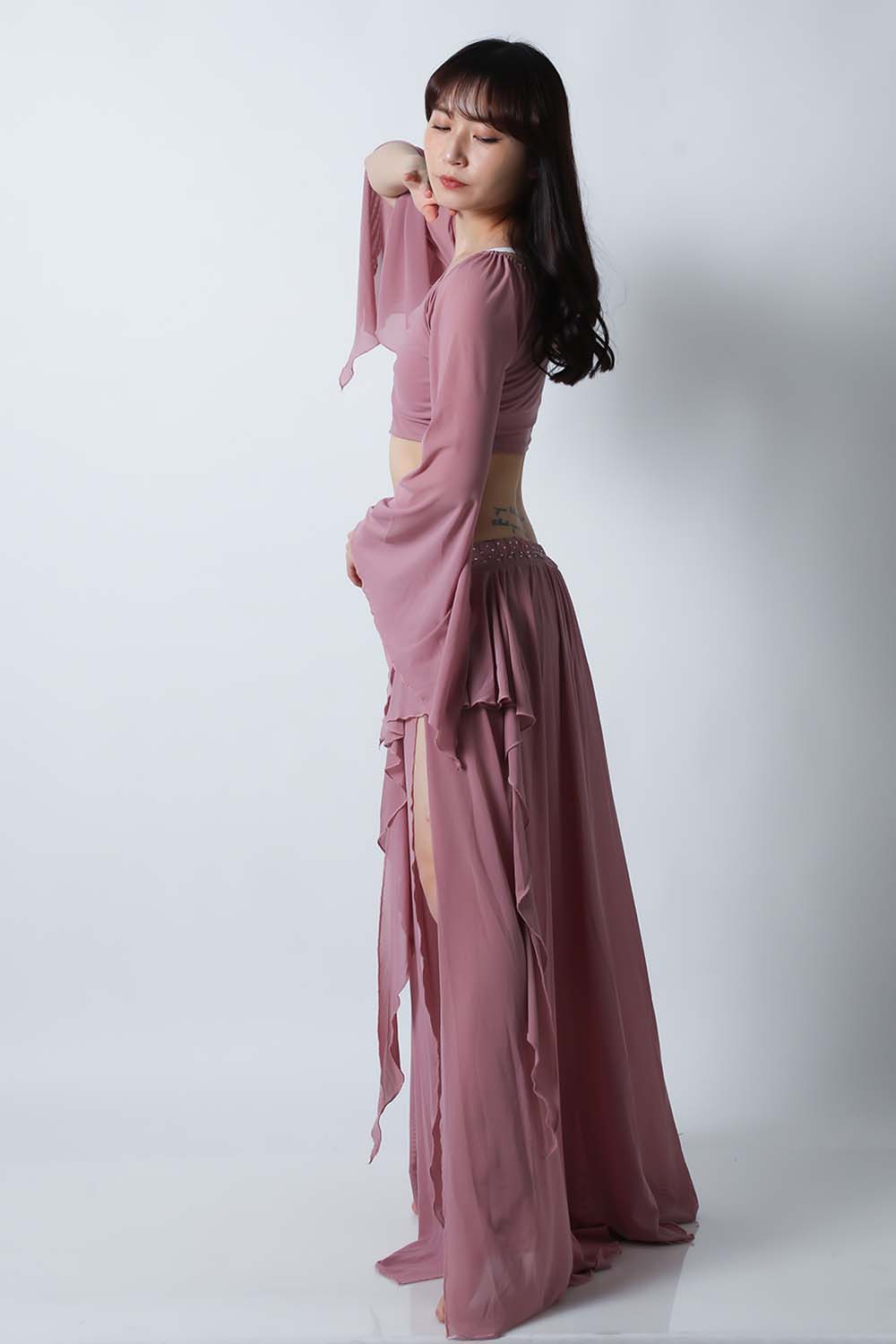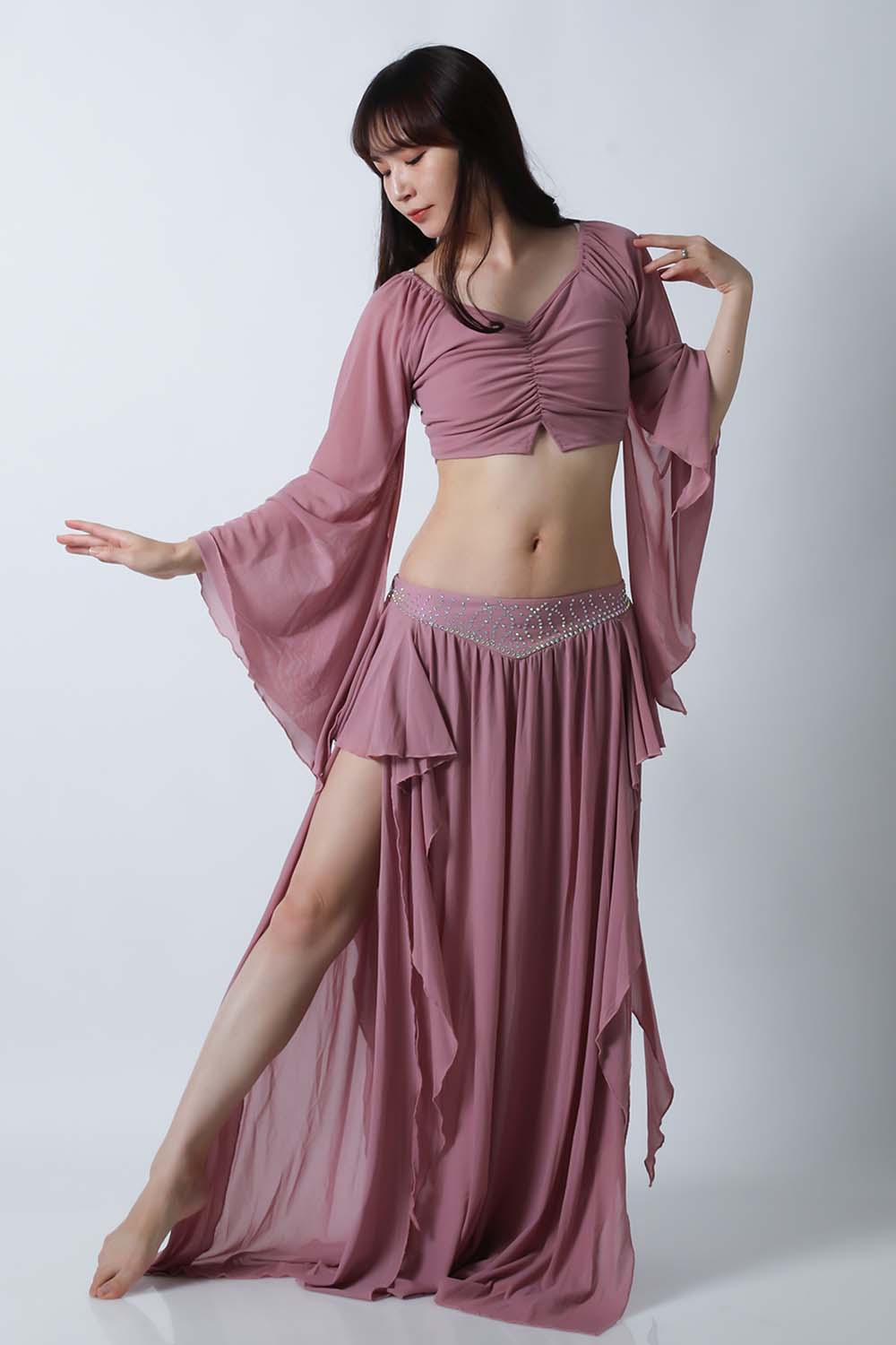 ベリーダンスレッスン用のトップス、スカートの2点セットです。微妙な色合いで、繊細な雰囲気を演出する色の生地を使用しています。トップスは袖幅が広く優雅な動きに魅せてくれます。スカートはフレアタイプで上品なイメージを演出してくれます。インナーショーツが縫い付けられていますので安心です。