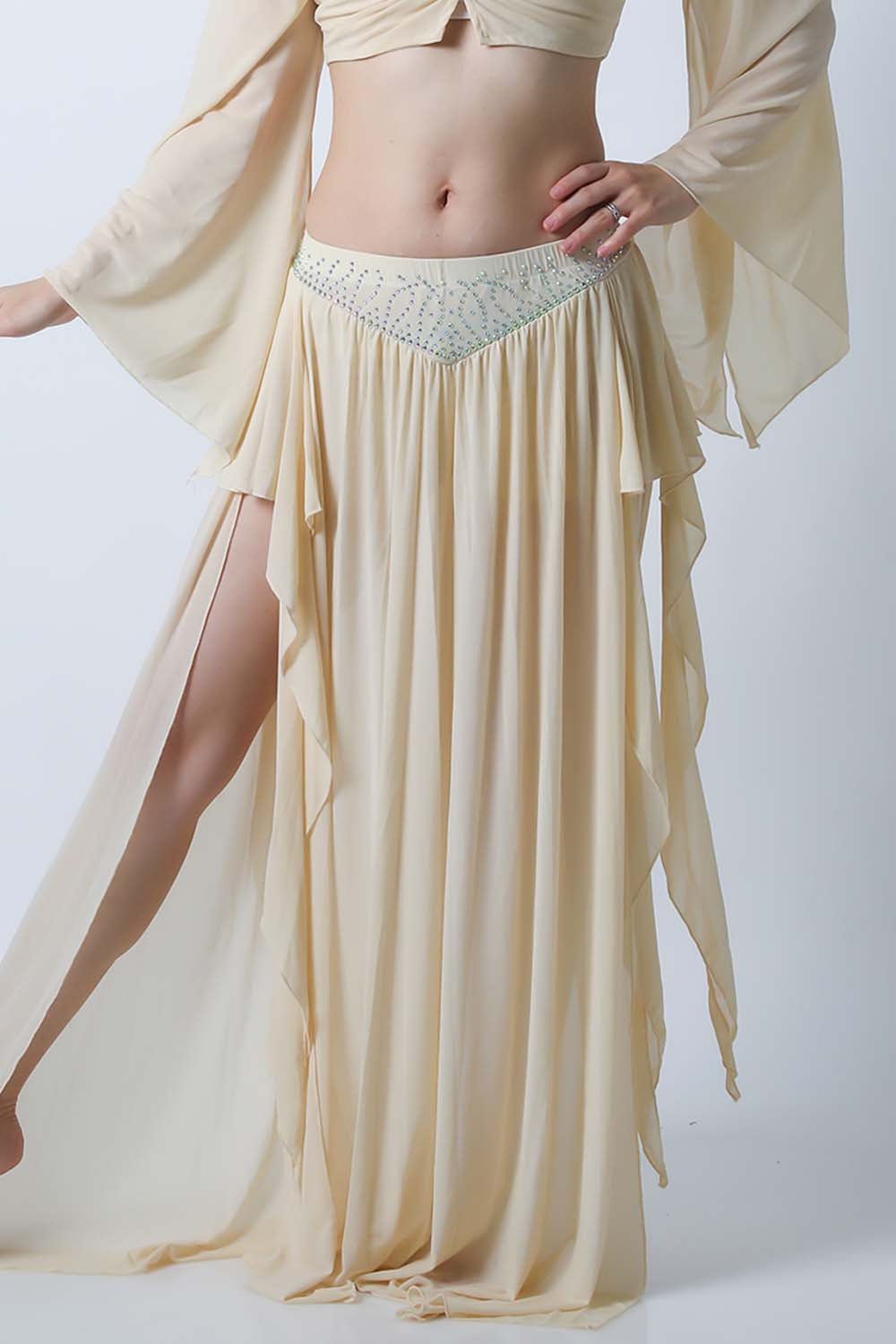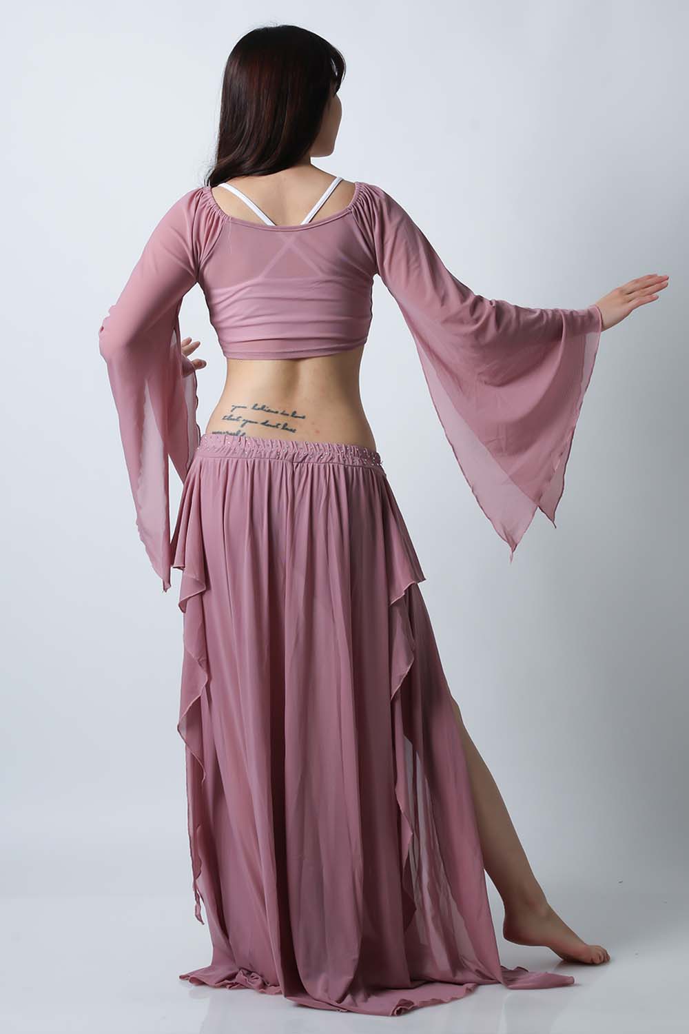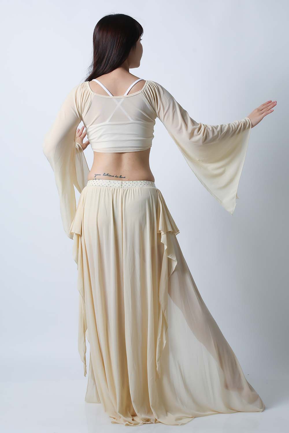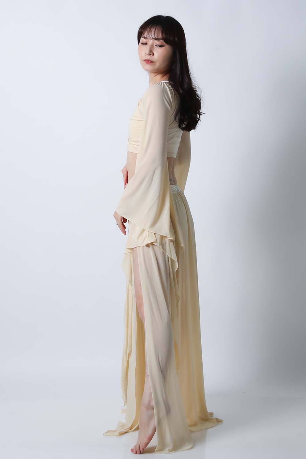 ベリーダンスレッスン用のトップス、スカートの2点セットです。微妙な色合いで、繊細な雰囲気を演出する色の生地を使用しています。トップスは袖幅が広く優雅な動きに魅せてくれます。スカートはフレアタイプで上品なイメージを演出してくれます。インナーショーツが縫い付けられていますので安心です。
