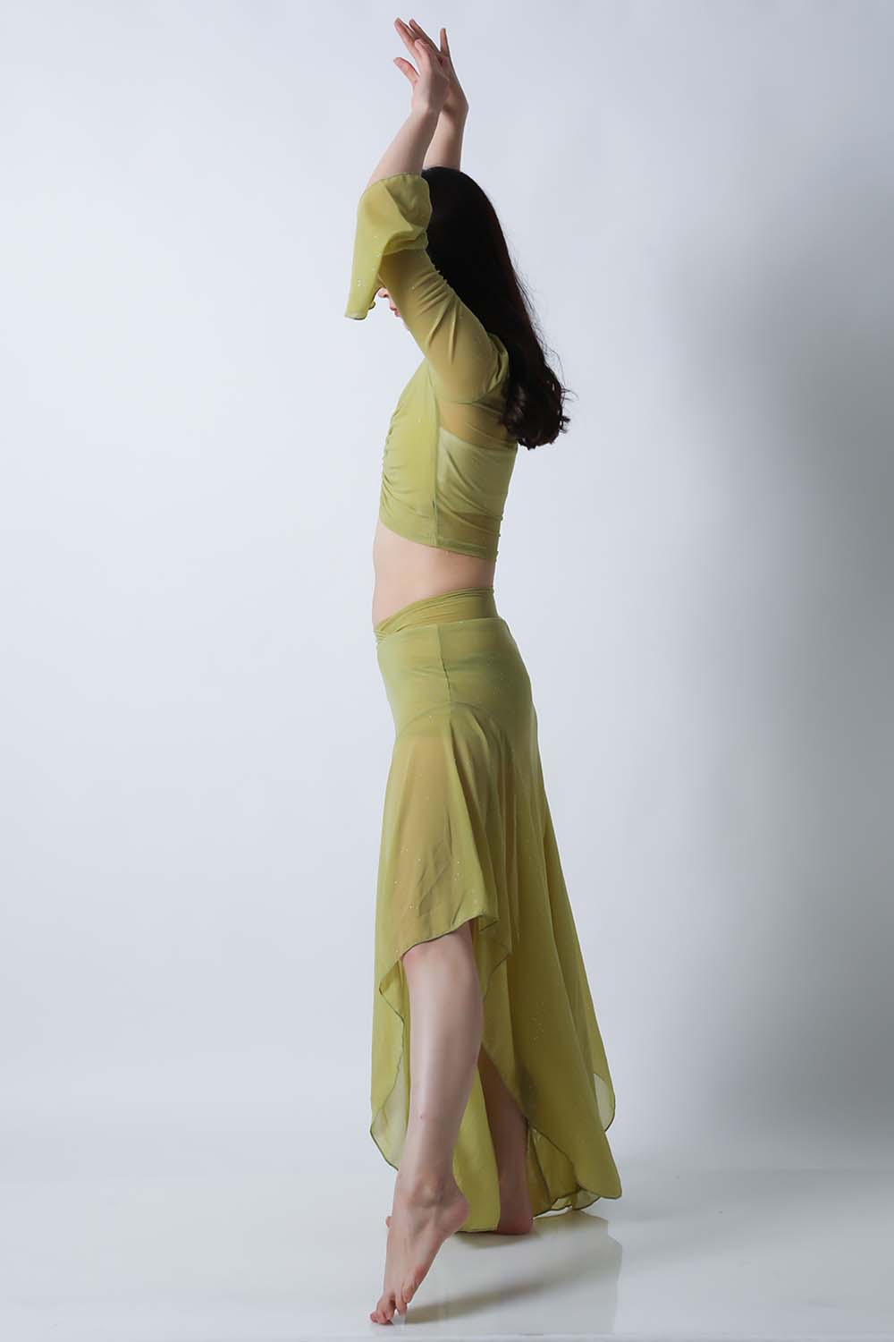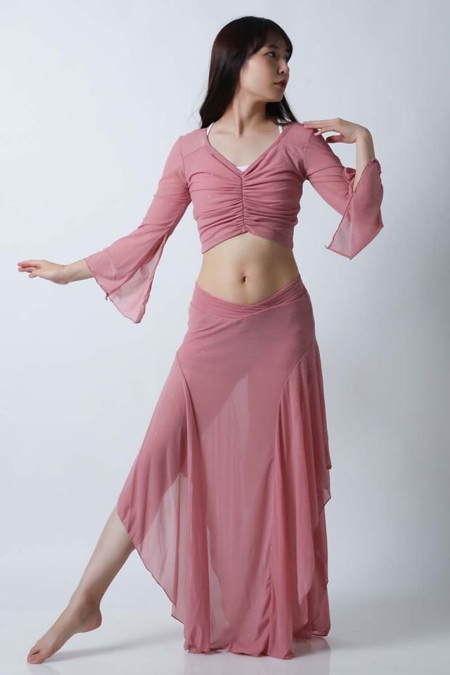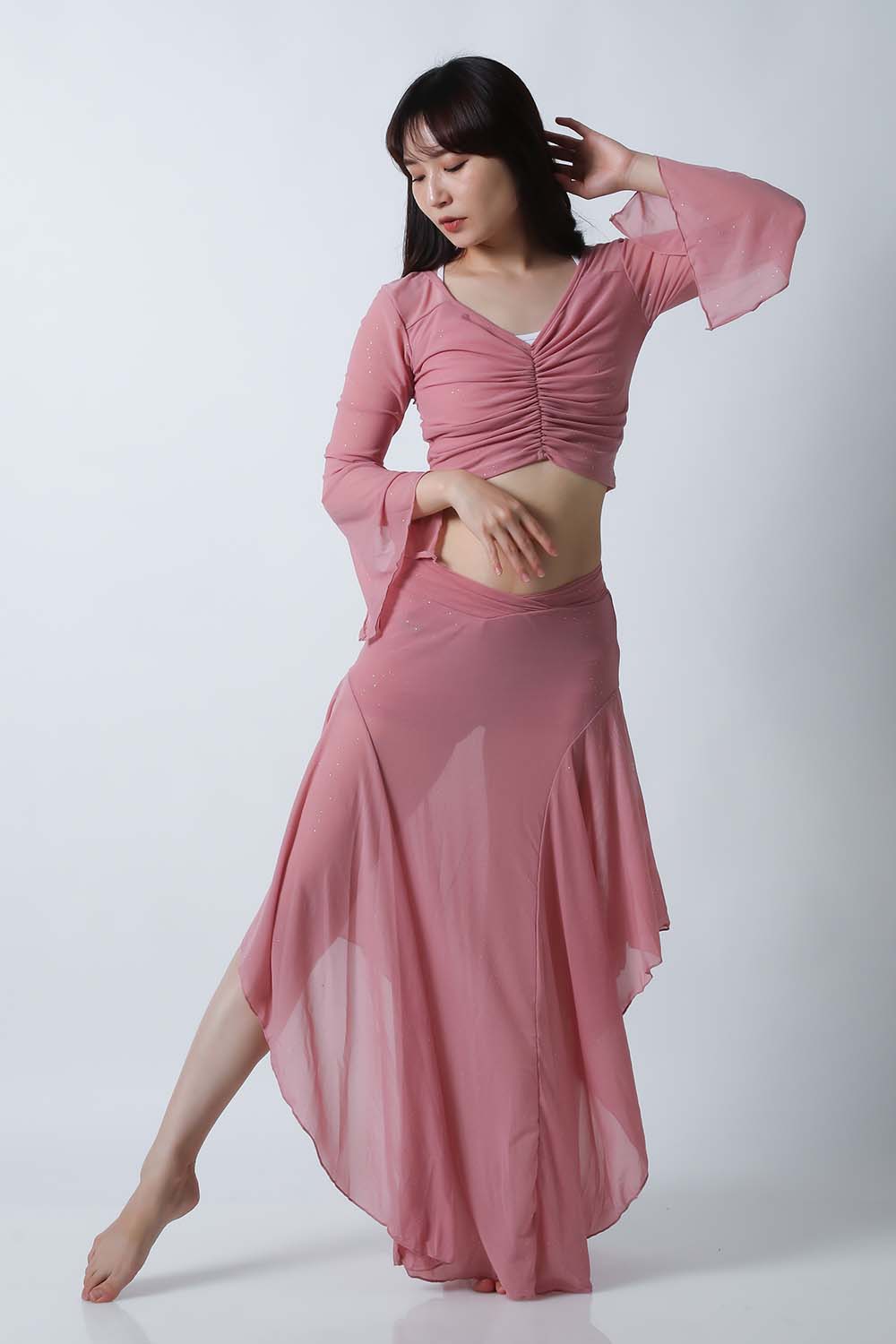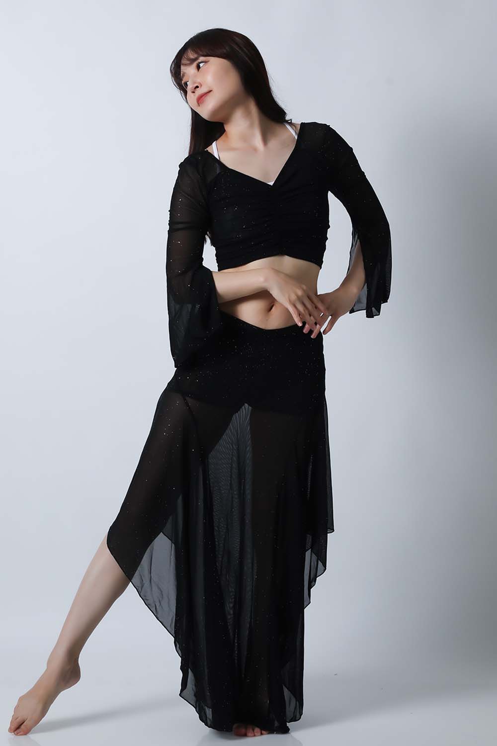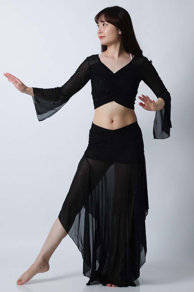 ベリーダンスレッスン用のトップス、スカートの2点セットです。軽くて踊りやすいレッスンウエアです。ラメ入りですので踊るたびにキラキラ輝きます。インナーショーツが縫い付けられていますので安心です。
