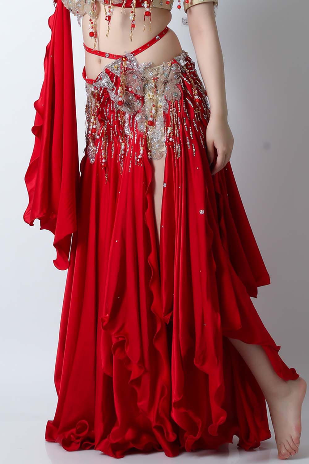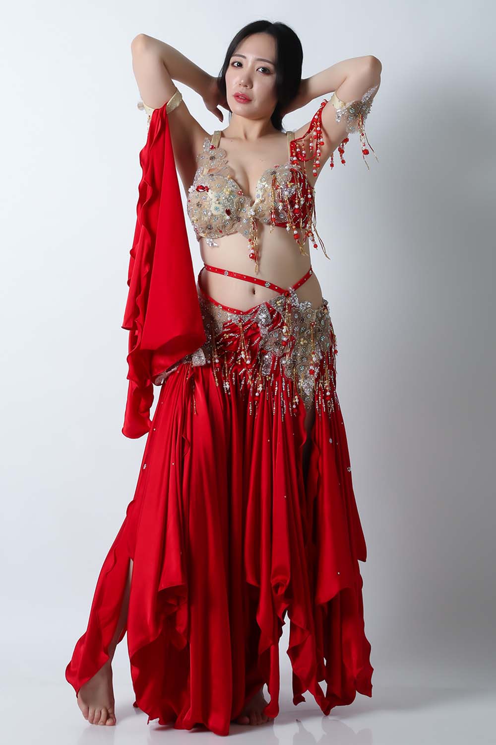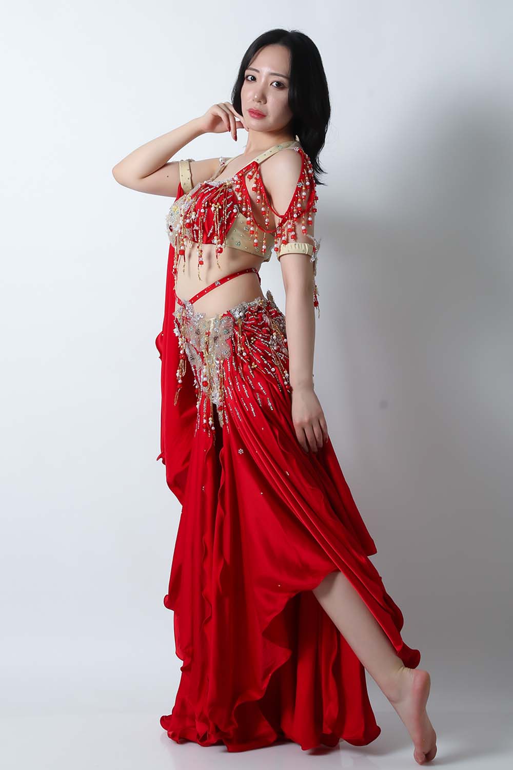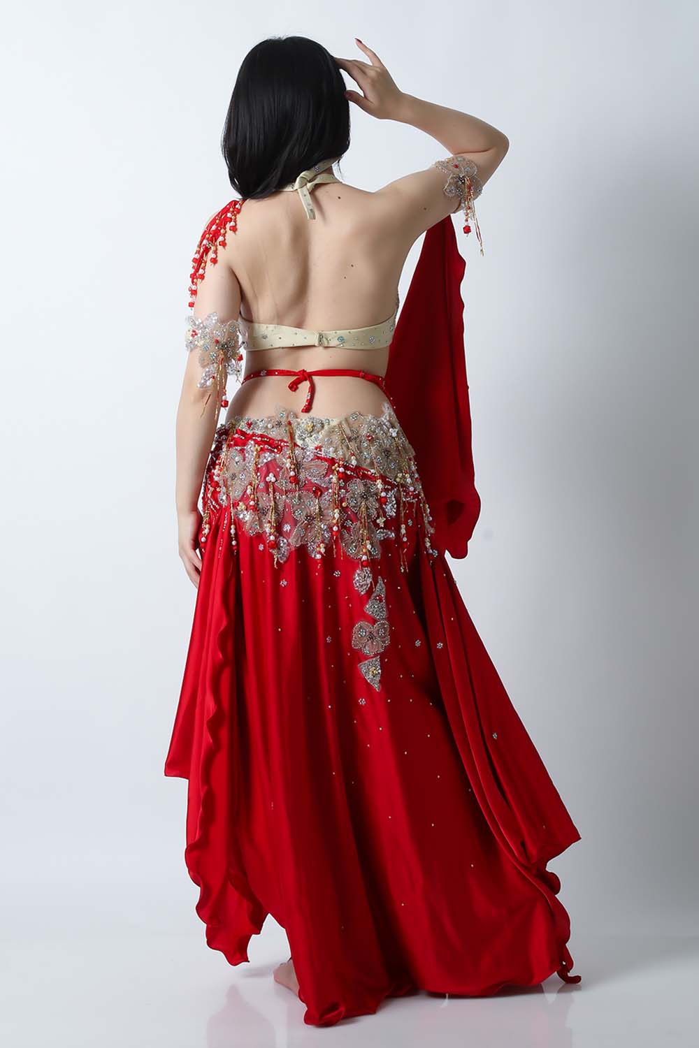 人気のデザイナーHoydaのエジプト製ベリーダンスコスチュームです。人気の赤単色の衣装です。ぱっと目を引きますので舞台映えすること間違いなしです。パールモチーフの装飾が多数施されています。スカートはインナーショーツも縫い付けられていますので安心です。ブラ、スカート、アームバンド(2本)のセットです。
