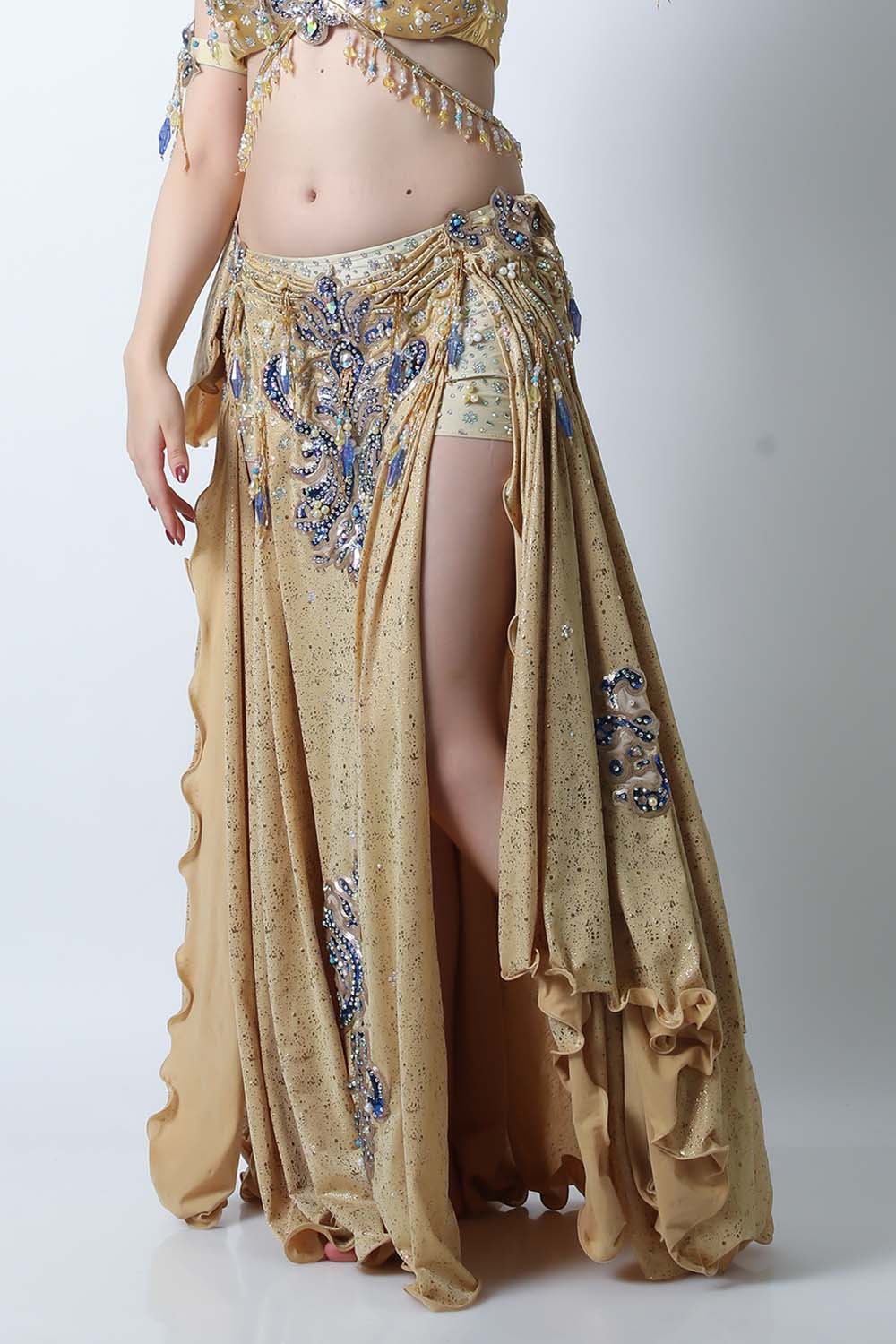 人気のデザイナーHoydaのエジプト製ベリーダンスコスチュームです。ブラは光沢があり、スカートはラメ入りの舞台映えする衣装です。ブラ下のフリンジがゴージャス感をUPしてくれます。ヌーディカラーでさりげなくセクシーな衣装です。スカートはインナーショーツも縫い付けられていますので安心です。ブラ、スカート、アームバンド(2本)のセットです。