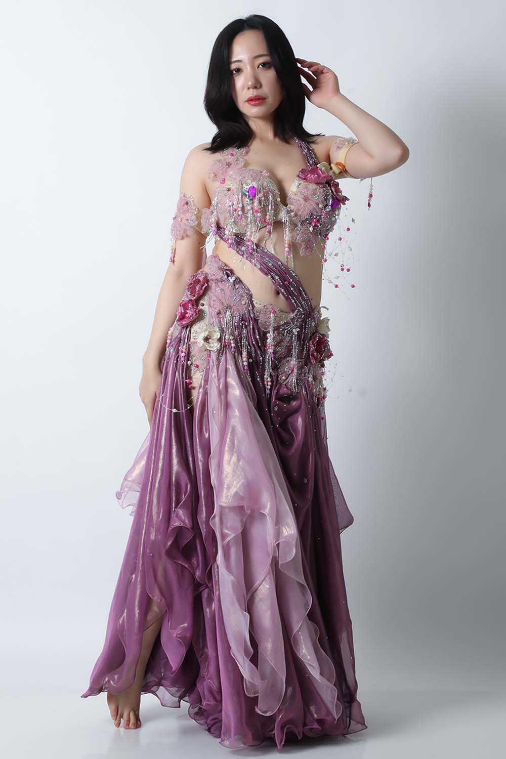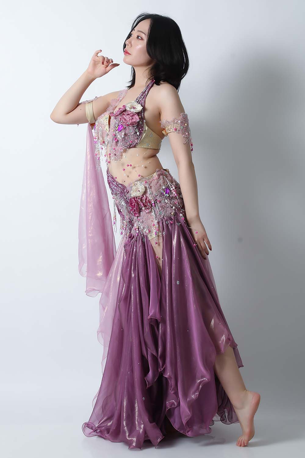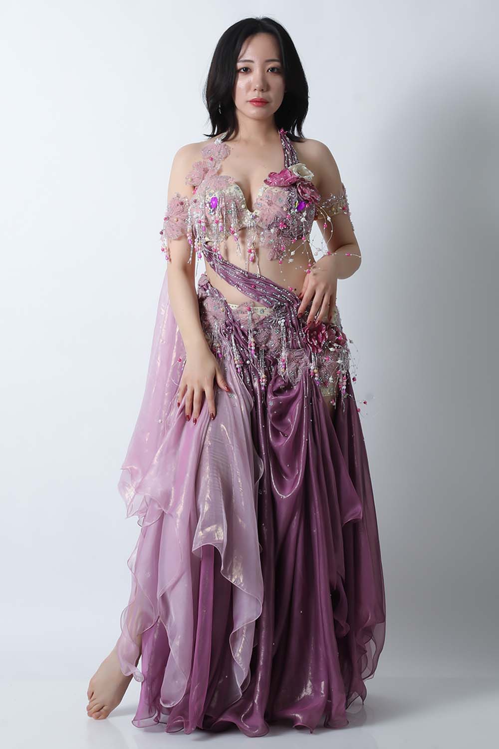 人気のデザイナーHoydaのエジプト製ベリーダンスコスチュームです。パープルとピンクの生地を組み合わせた衣装です。大きめのコサージュが多数施されており立体感があります。テグスに通したパールモチーフの装飾も動きがありゴージャス感溢れるコスチュームです。スカートはインナーショーツも縫い付けられていますので安心です。ブラ、スカート、アームバンド(2本)のセットです。