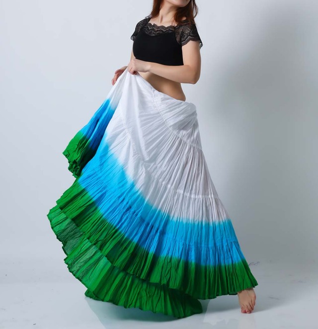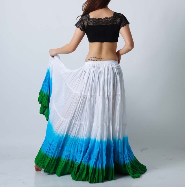 ベリーダンスのトライバル、ジプシーには欠かせない25ヤードスカート(コットン)です。軽くて風合いのよいコットンを使用しており、発色がよいのが特長です。こちらは明るく爽やかなイメージ(ホワイト/水色/緑)(white/lightblue/green)の25ヤードスカートです。