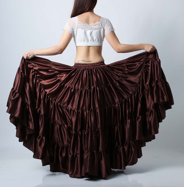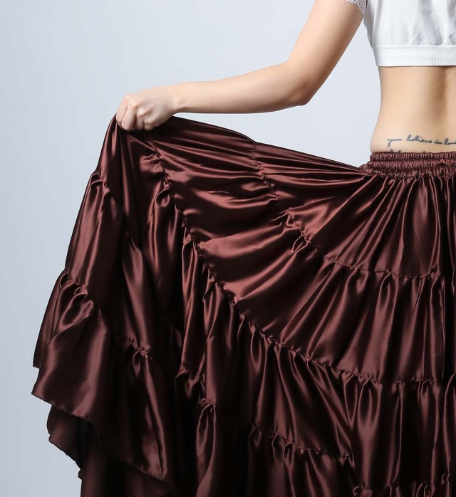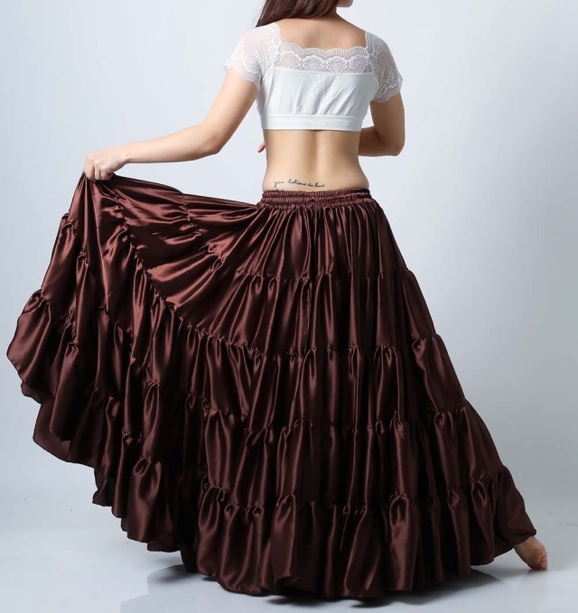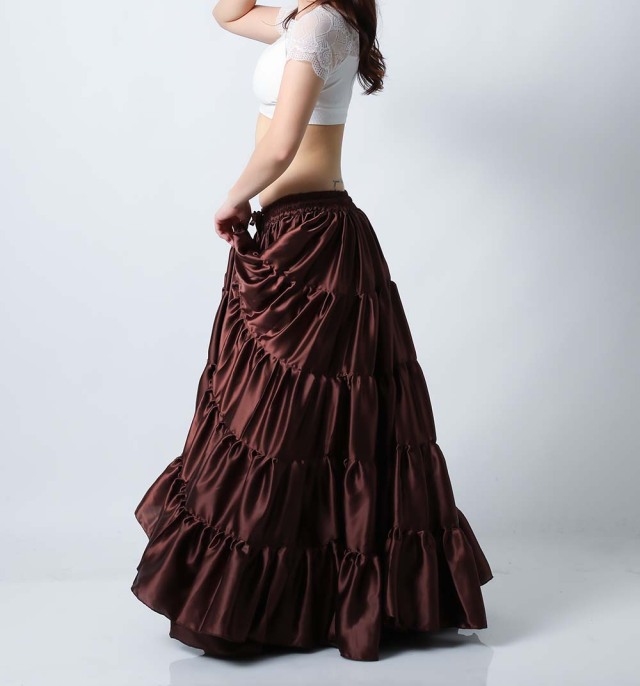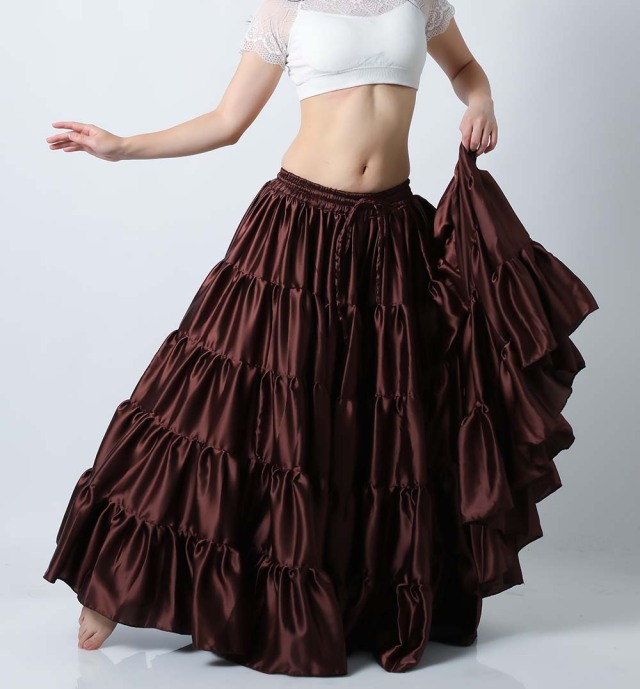 サテン生地なので光沢があり、ギャザー部分もふんわりしていてボリュームがあり、ゴージャスな印象です。こちらは高級感のあるブラウンです。 スカート単品の販売です。(トップス、ヒップスカーフ等は商品に含まれません) 画像では5段のスカートになっていますが入荷時期や商品により4段になる場合がございます。 *注.こちらの商品は海外での染物であり色移り、色落ちする場合がございます。他の衣類と一緒に洗濯、保管しないようお願いいたします。特に色の薄い色の衣類を着用される場合はご注意ください。 |