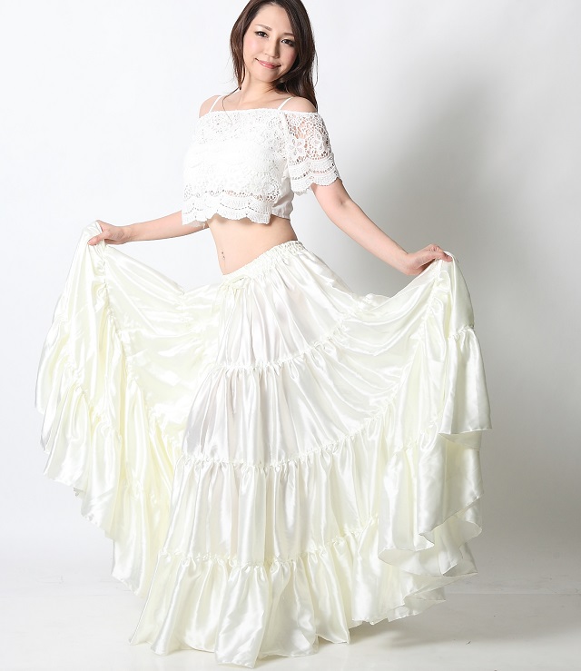 サテン生地なので光沢があり、ギャザー部分もふんわりしていてボリュームがあり、ゴージャスな印象です。こちらは清楚な雰囲気のホワイトです。 スカート単品の販売です。(トップス、ヒップスカーフ等は商品に含まれません) 画像では5段のスカートになっていますが入荷時期や商品により4段になる場合がございます。 *注.こちらの商品は海外での染物であり色移り、色落ちする場合がございます。他の衣類と一緒に洗濯、保管しないようお願いいたします。特に色の薄い色の衣類を着用される場合はご注意ください。 |