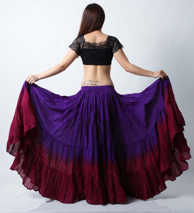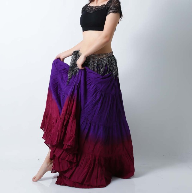 ベリーダンスのトライバル、ジプシーには欠かせない25ヤードスカート(コットン)です。軽くて風合いのよいコットンを使用しており、発色がよいのが特長です。パープルとワインの2色使いで華やかな25ヤードスカートです。