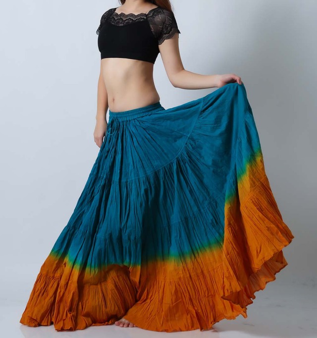 ベリーダンスのトライバル、ジプシーには欠かせない25ヤードスカート(コットン)です。軽くて風合いのよいコットンを使用しており、発色がよいのが特長です。まるで砂漠のオアシスのようなイメージが感じられる(ティール/カーキー)(teal/khaki)の25ヤードスカートです。