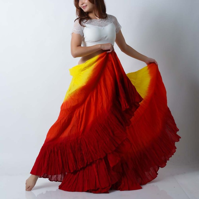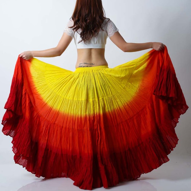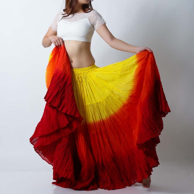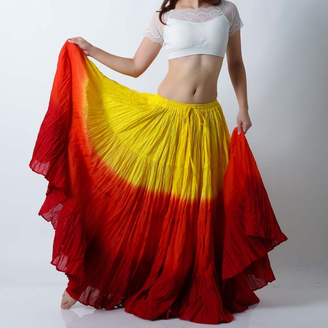 ベリーダンスのトライバル、ジプシーには欠かせない25ヤードスカート(コットン)です。軽くて風合いのよいコットンを使用しており、発色がよいのが特長です。こちらは情熱的な色の組み合わせ(黄色イエロー/オレンジ/赤レッド)の25ヤードスカートです。