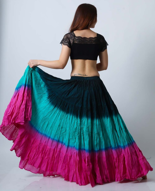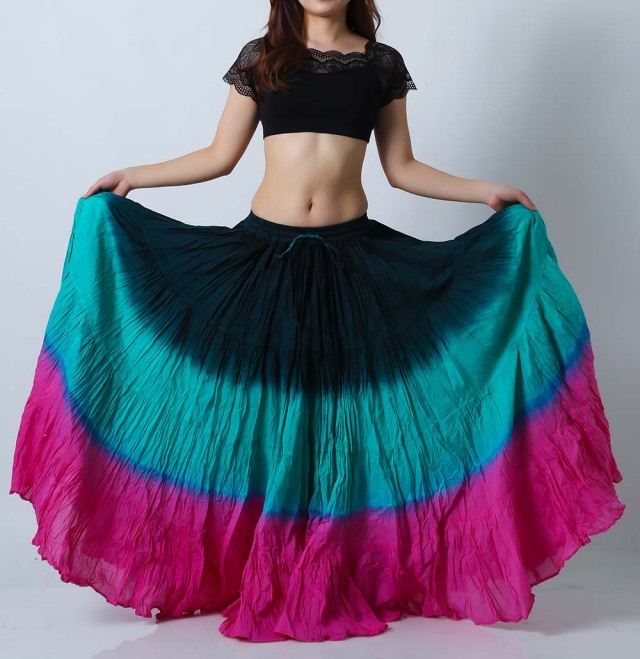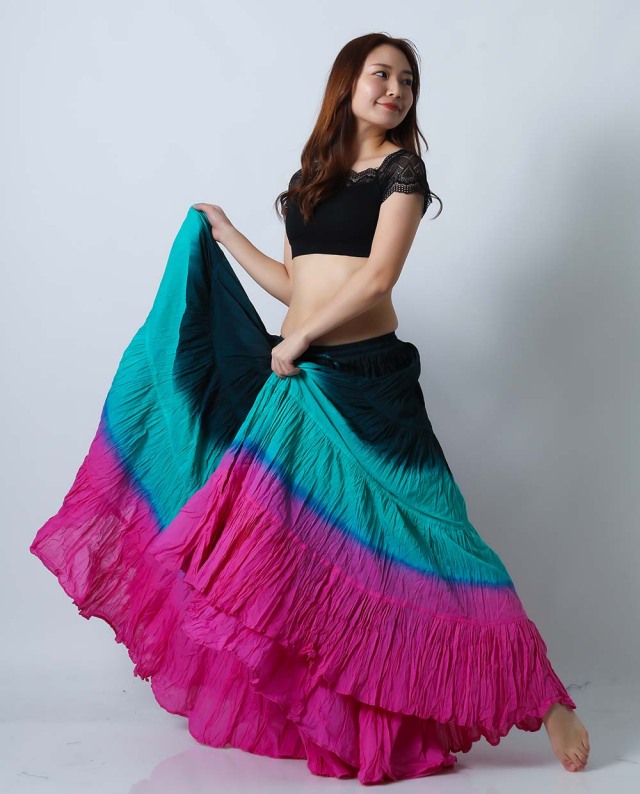 ベリーダンスのトライバル、ジプシーには欠かせない25ヤードスカート(コットン)です。軽くて風合いのよいコットンを使用しており、発色がよいのが特長です。こちらは他の人と被りにくい色の組み合わせ(ティールグリーン/エメラルドグリーン/ピンク)(teal green/emerald green/pink)の25ヤードスカートです。