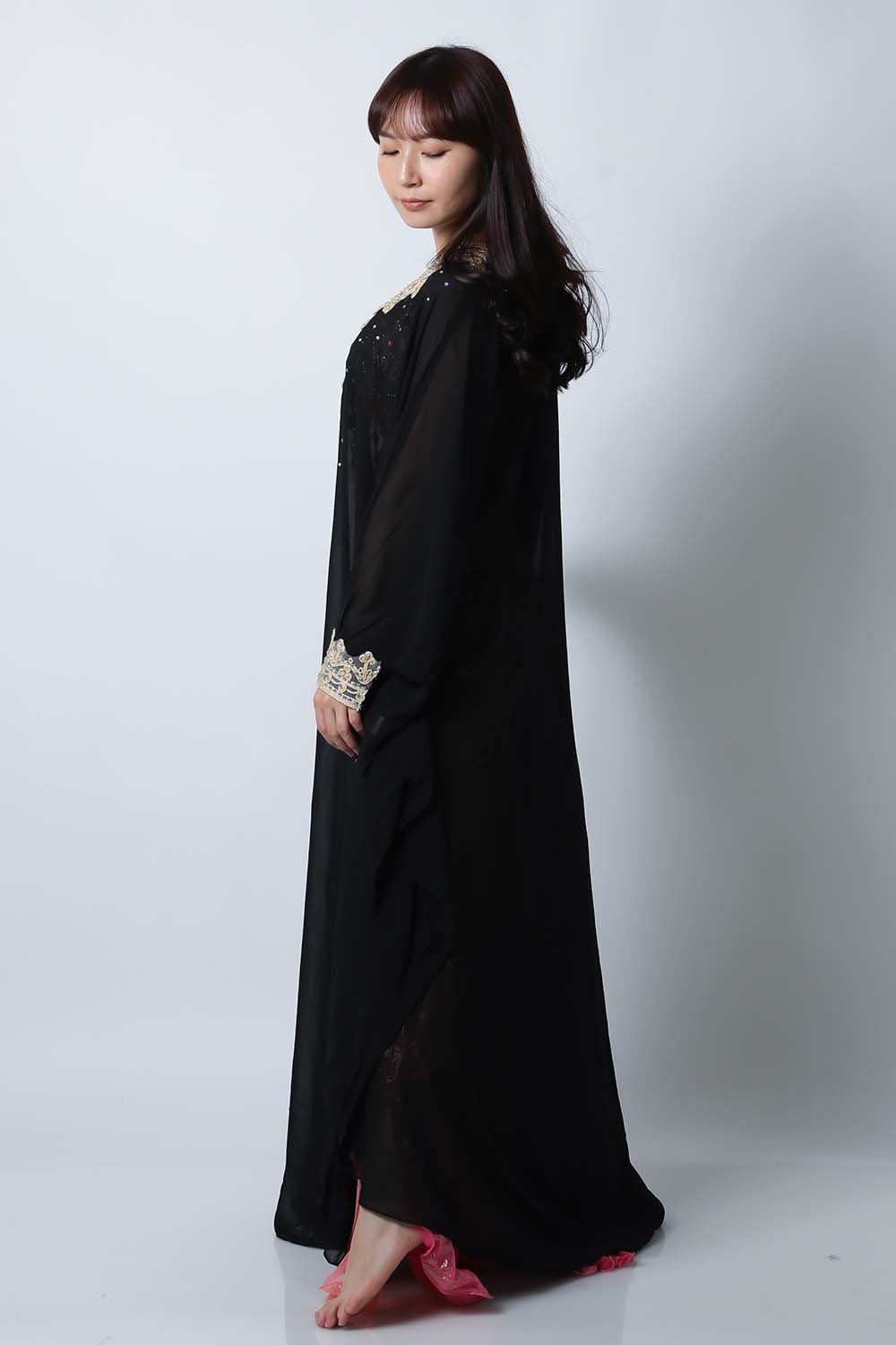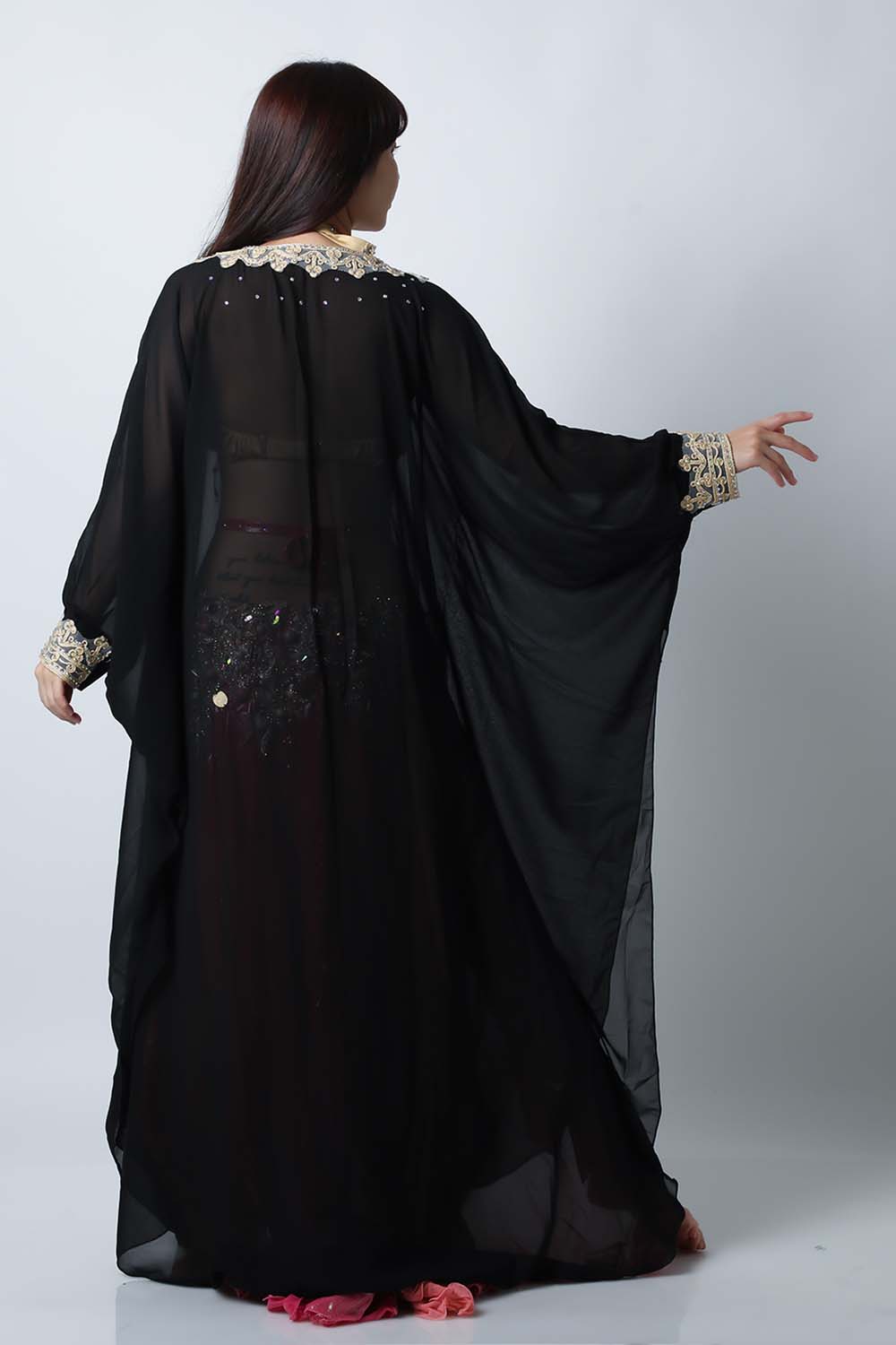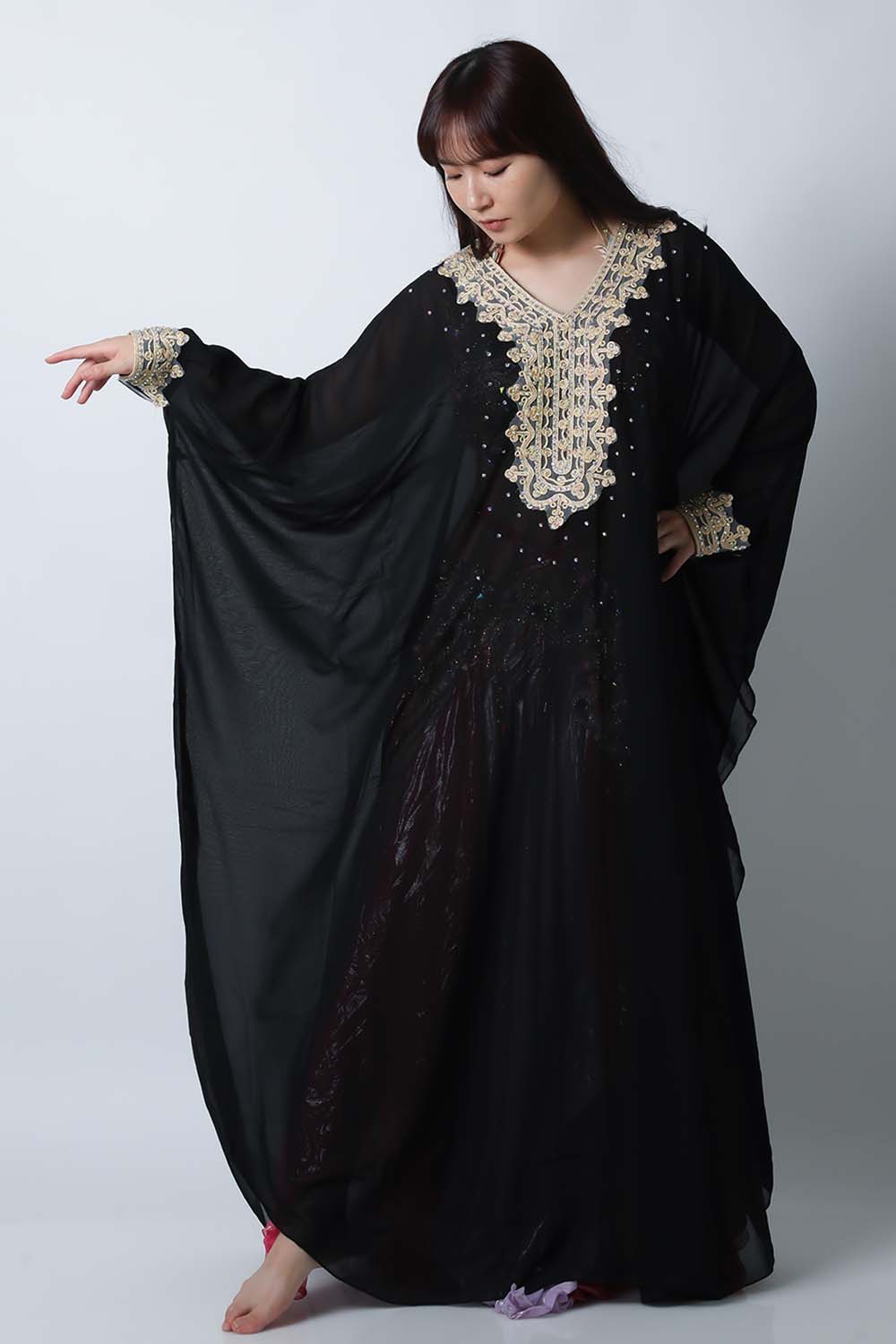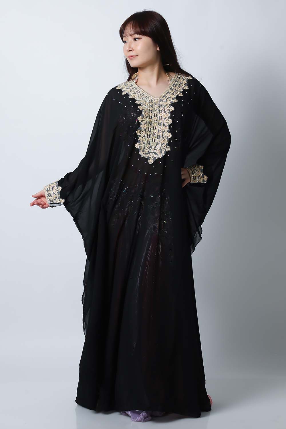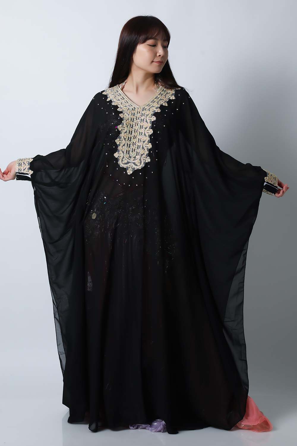 ベリーダンスで使用するハリージドレスです。装飾は首下と袖口のみのシンプルなデザインですので軽くて踊りやすいです。縫製も良好ですのでスパンコールが落ちたりする心配もあまりありません。発表会やイベントの衣装だけでなく羽織としてもお勧めです。こちらは上品な黒ブラックです。