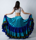 ベリーダンスのトライバル、フラメンコフュージョン、スパニッシュフュージョンにおすすめです。サテン生地なので光沢があり、ギャザー部分もふんわりしていてボリュームがあります。こちらは爽やかなライトブルー、ブルー、グリーンの25ヤードスカートです。
