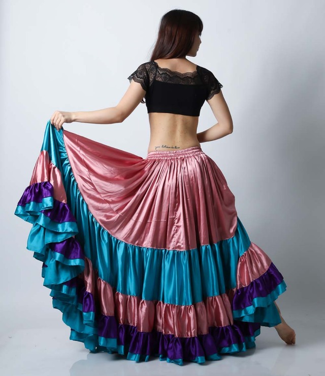 ベリーダンスのトライバル、フラメンコフュージョン、スパニッシュフュージョンにおすすめのスカートです。サテン生地なので光沢があり、ギャザー部分もふんわりしていてゴージャス感があります。こちらはピンク、ライトブルー、パープルの25ヤードスカートです。