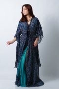 ダンス発表会のコスチュームの上に羽織っていただけるガラベーヤです。スパンコールやビーズで装飾されているデリケートなベリーダンス衣装の保護に最適です。前開きで紐を絞って結ぶタイプですので、衣装に引掛けてしまったり、ヘアスタイルを崩すことなく着脱していただけます。ステージ待ちのときにあると便利な一枚です。こちらは誰が着ても似合うネイビーの花柄ガラベーヤです。