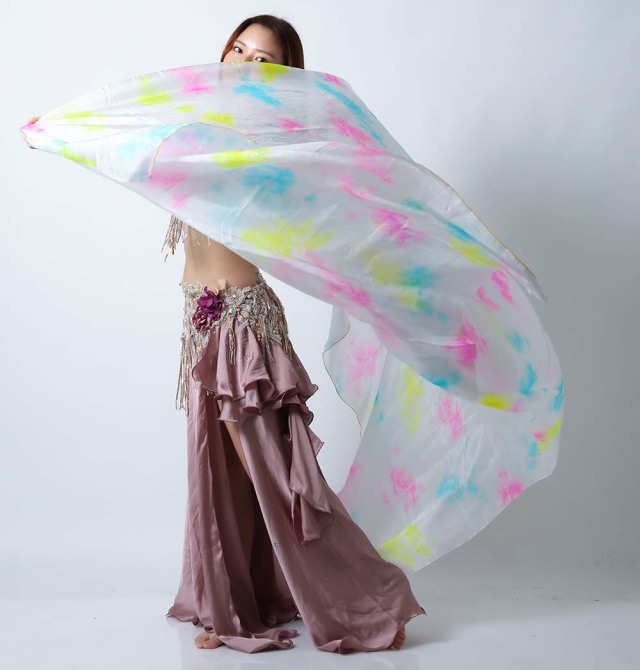 ベリーダンスで使用するシルクベールです。シルクを使用した独特の布地の感触がベリーダンスの妖艶な雰囲気にぴったりです。素材は中国製高級シルクを使用し手染めしたベールです。職人による手染めのため一枚一枚、色合いが違い、独特の風情があります。そのため色ムラ、色移り、斑点などが見られる場合がございます。製作過程においてこれらの現象は避けることができませんので不良品扱いはいたしません。シルクベールはシフォン、ポリエステル素材に比べ軽く、柔らかいのでふんわりと優雅にベリーダンスが踊れます。シワは霧吹きなどをかけると取れますが、商品が届いたら袋から掛けておくだけでも自然に取れていきます。こちらはホワイト、ピンク、ライトブルーがメインで水彩画風のイメージのシルクベールです。