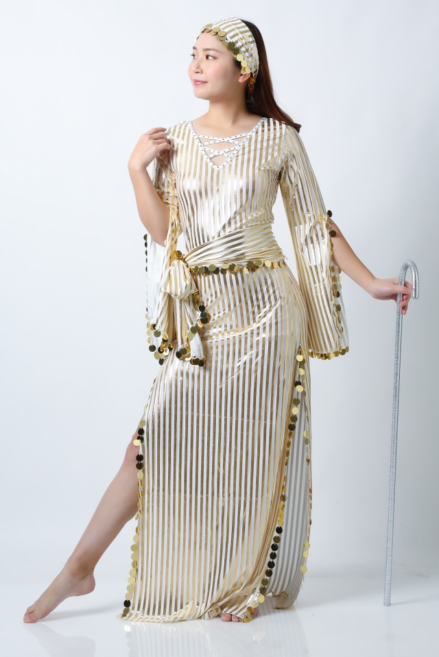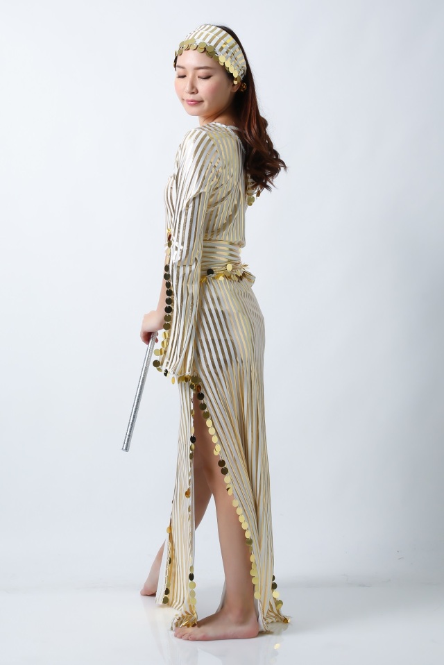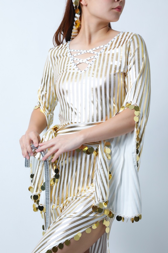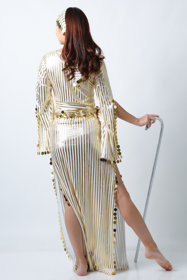 アサヤで踊る曲に最適なサイーディドレスです。縦長ラインを強調するストライプですのでスタイル良く見えます。エジプト製に比べて縫製が綺麗です。インナーショーツ付きですので安心して着用、踊ることができます。ドレス、スカーフ、ヘアバンド、インナーショーツの4点セットです。
