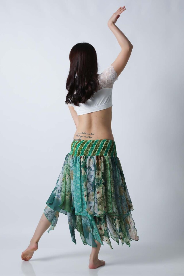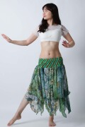 ベリーダンスのレッスン、発表会どちらでも使えるトライバルスカートです。レッスン着としても良いし、ジプシースカートや25ヤードスカートの上に重ねて着ても良いです。軽くて踊りやすい素材ですので動きやすくて、持ち運びもラクです。今現在同じ柄の商品は在庫一枚ですので他の人と被る心配もありません。いつものスカートやレギンスにアレンジするだけでOKです。
