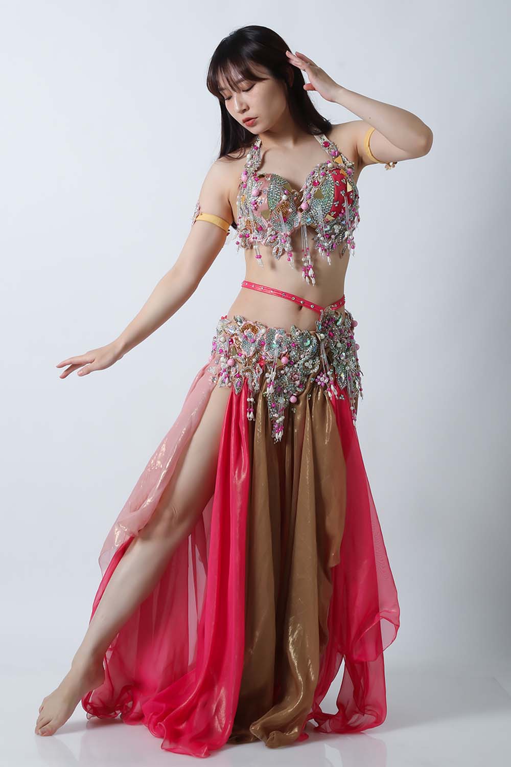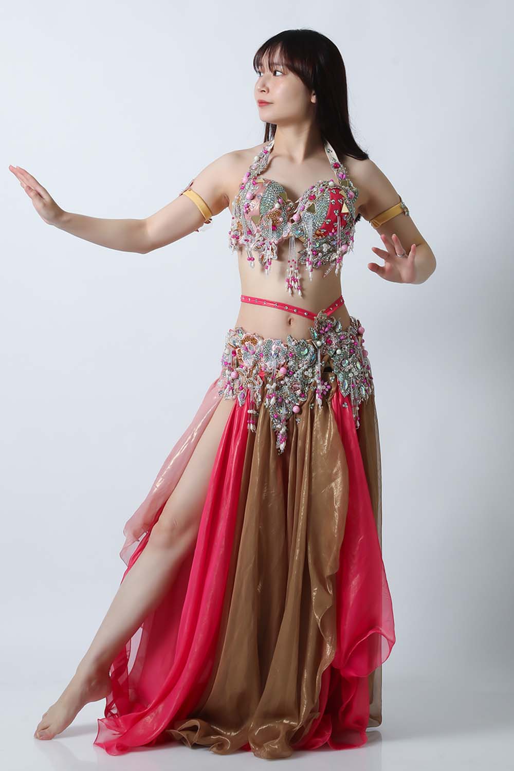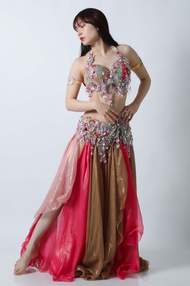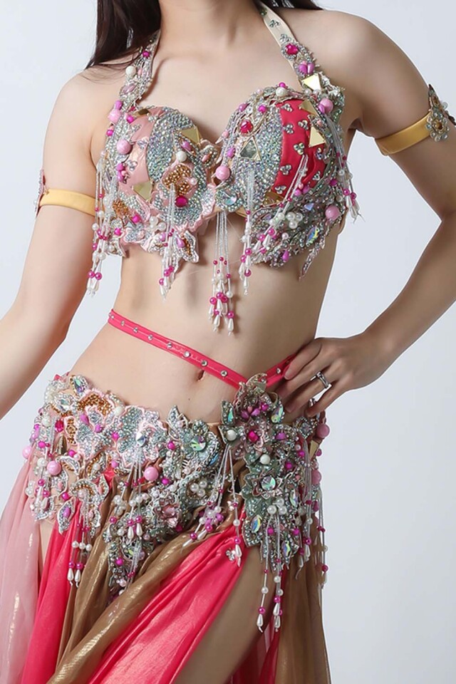 エジプト製デザイナー【Amr】のベリーダンスコスチュームです。ブラウンとピンクの生地を組み合わせた衣装です。大きめのピンクのパールモチーフが印象的です。落ち着きと甘さが絶妙に溶け合っていて、とっても魅力的です。インナーショーツが縫い付けられていますので安心して踊れます。ブラ、スカート、アームバンド(2枚)のセットです。