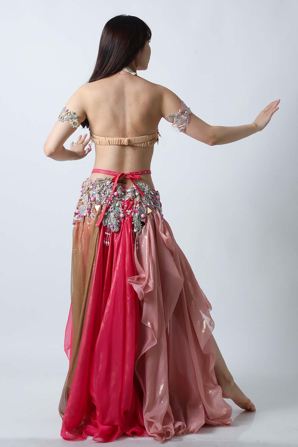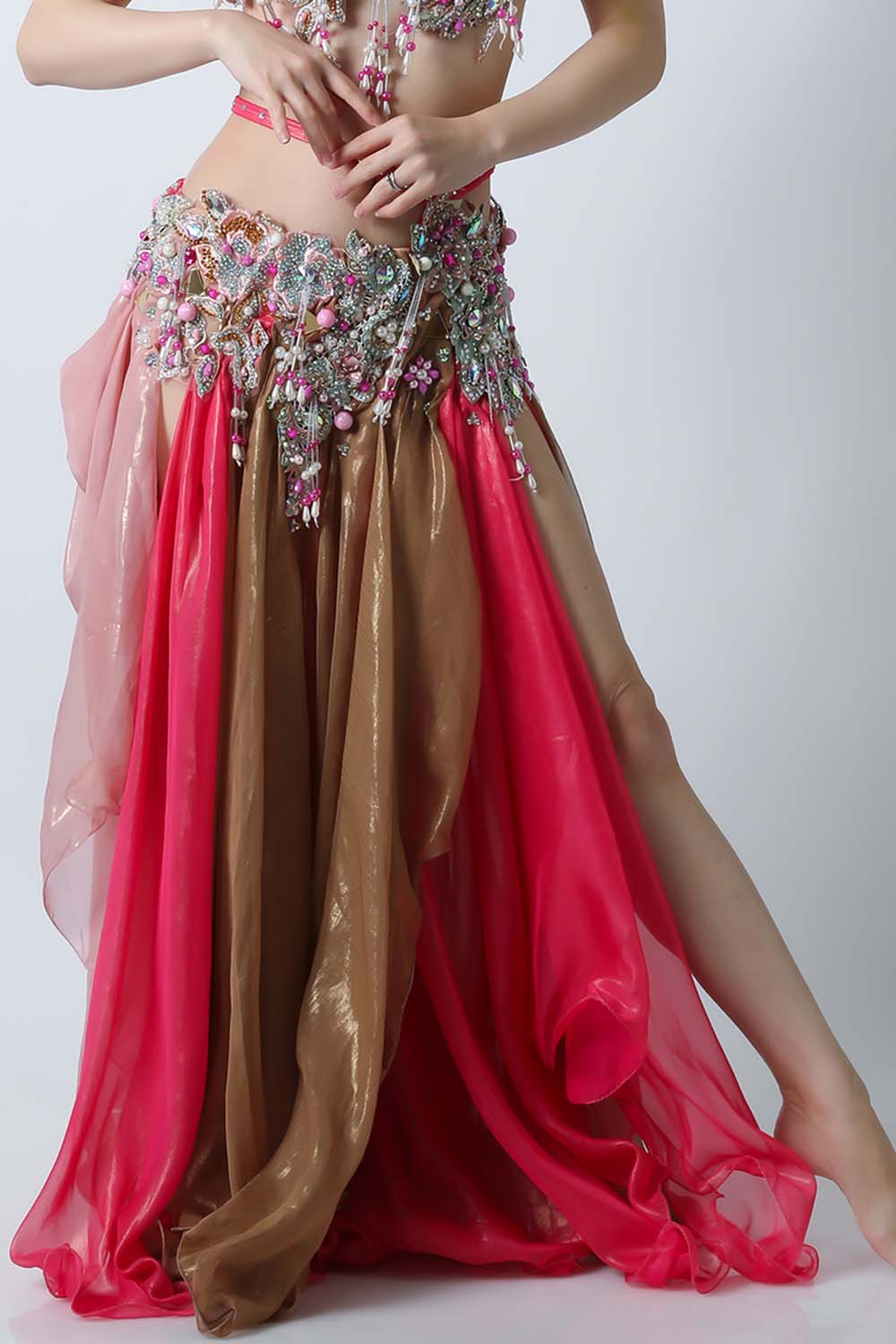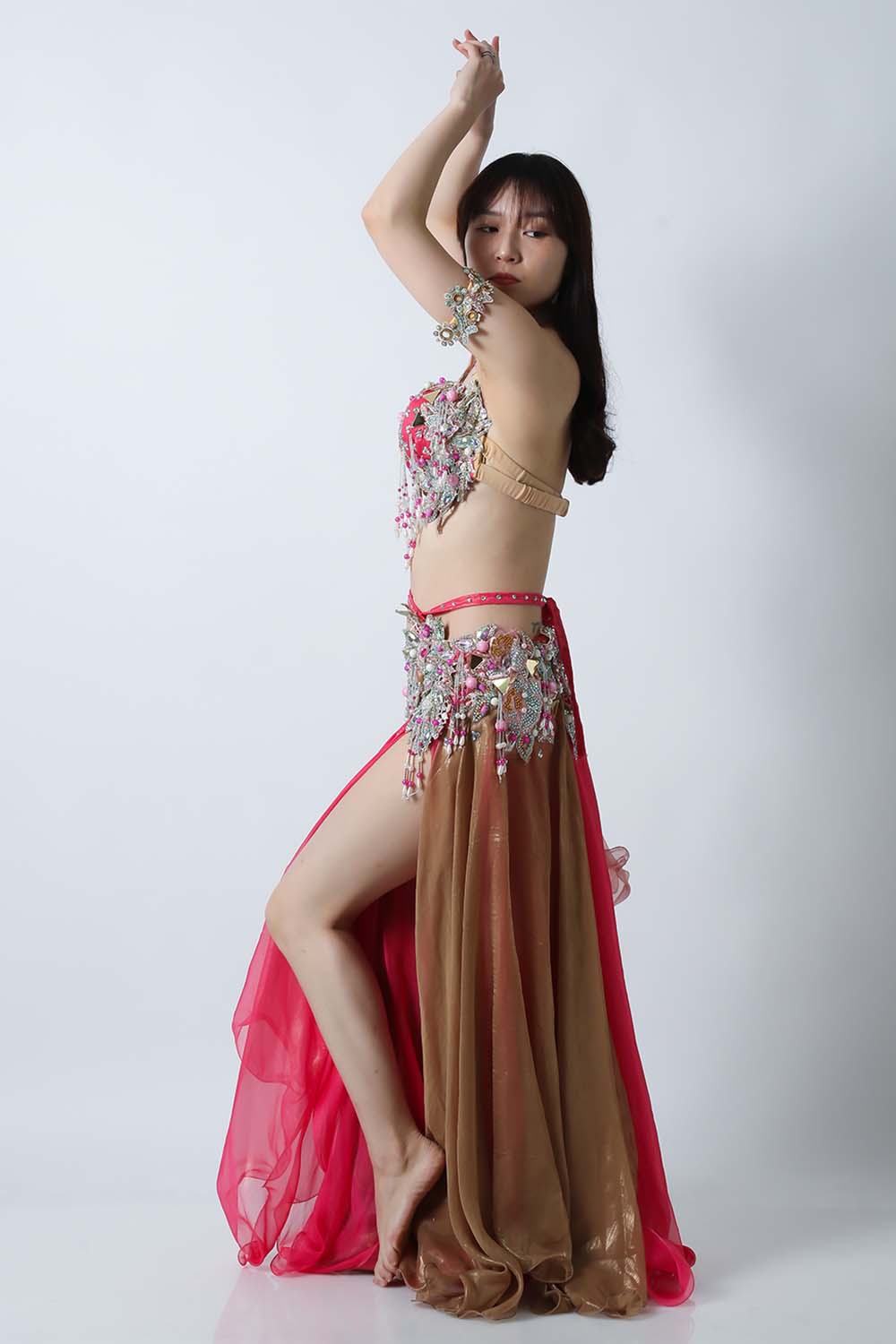 エジプト製デザイナー【Amr】のベリーダンスコスチュームです。ブラウンとピンクの生地を組み合わせた衣装です。大きめのピンクのパールモチーフが印象的です。落ち着きと甘さが絶妙に溶け合っていて、とっても魅力的です。インナーショーツが縫い付けられていますので安心して踊れます。ブラ、スカート、アームバンド(2枚)のセットです。