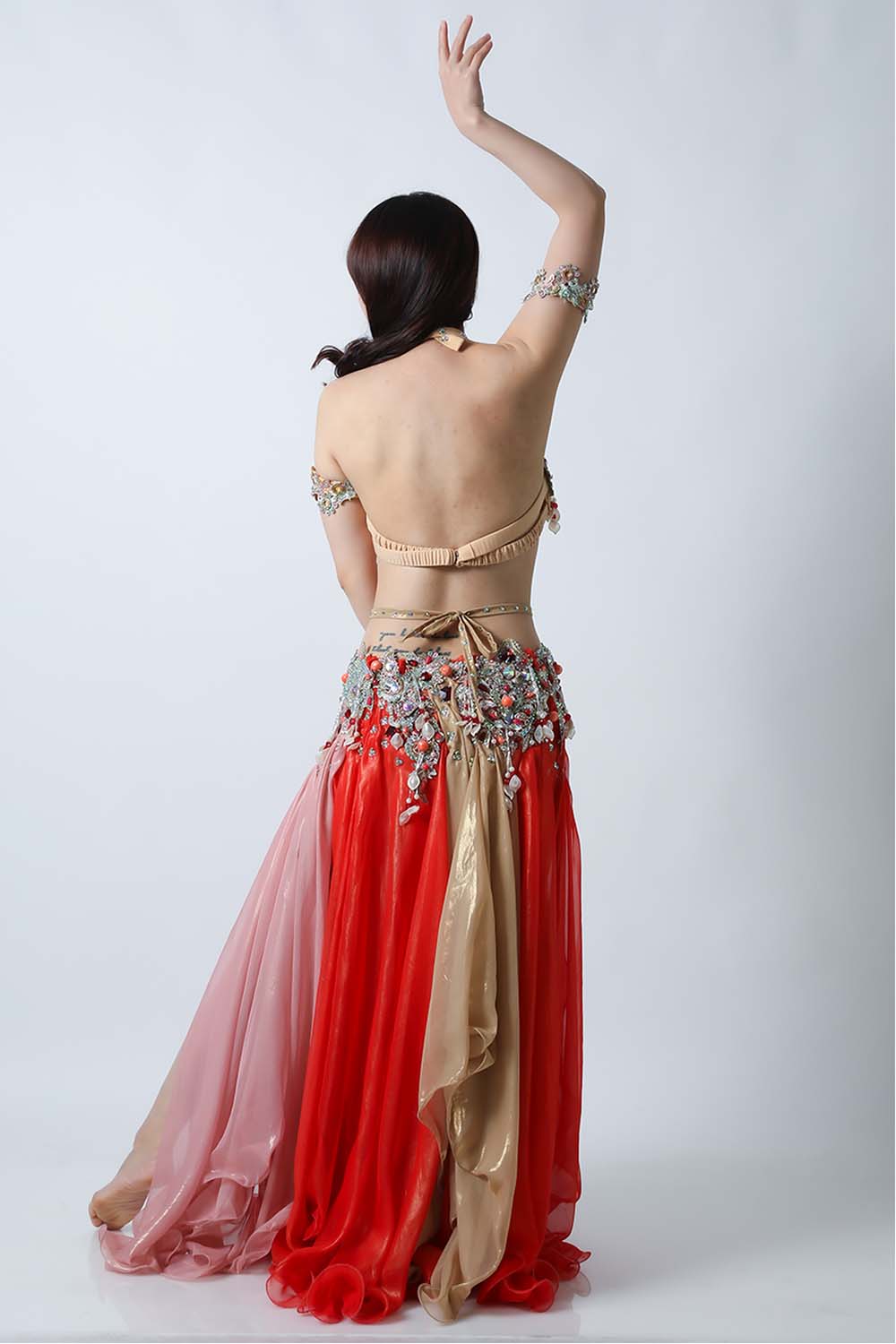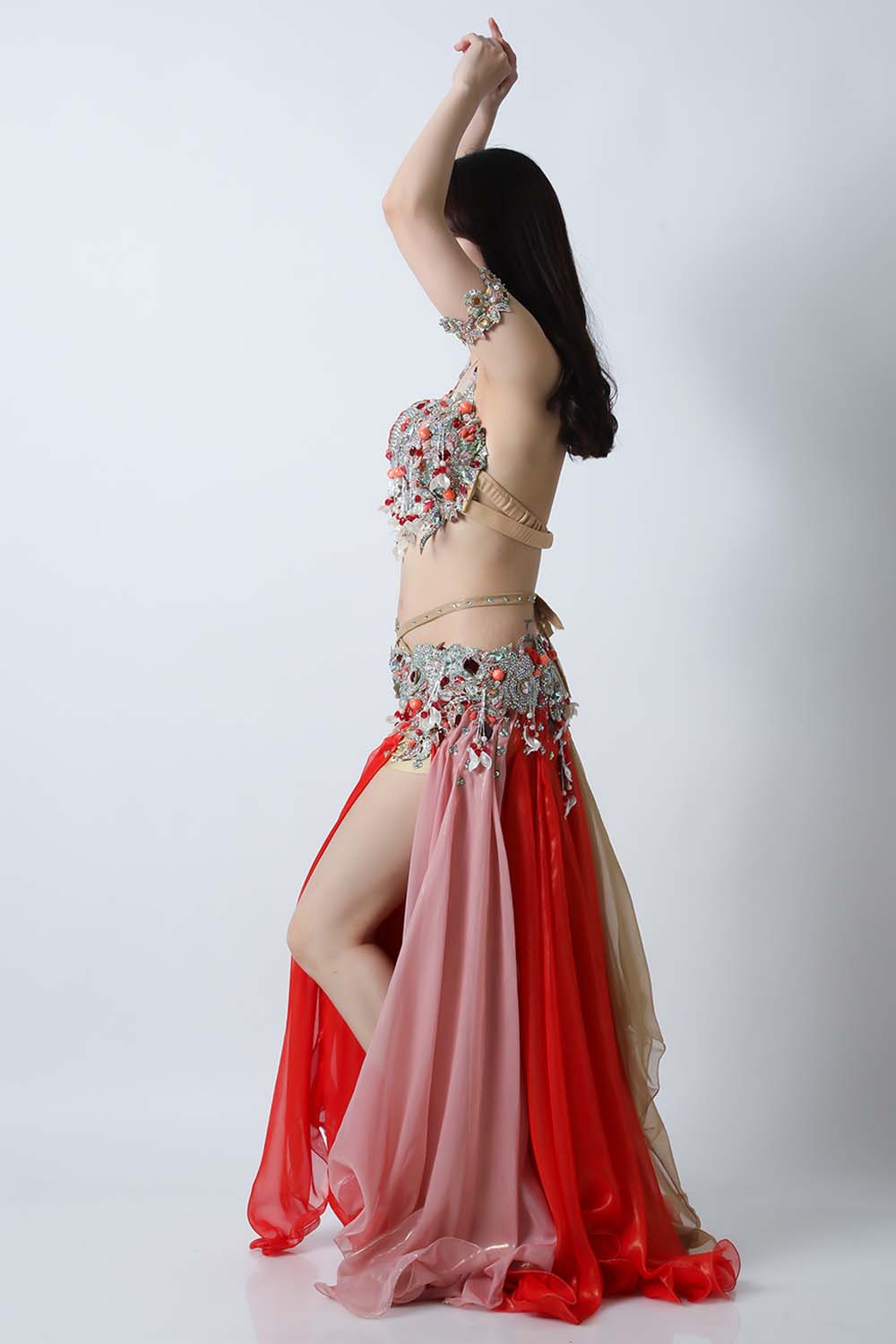 エジプト製デザイナー【Amr】のベリーダンスコスチュームです。ブラウン、レッド、ピンクの生地を組み合わせた衣装です。ルビー色のビジューが魅力的です。軽くて踊りやすい衣装です。インナーショーツが縫い付けられていますので安心して踊れます。ブラ、スカート、アームバンド(2枚)のセットです。