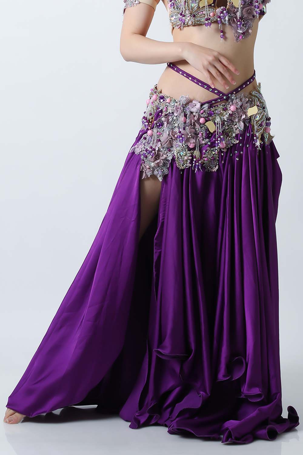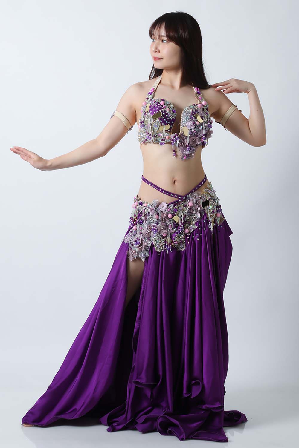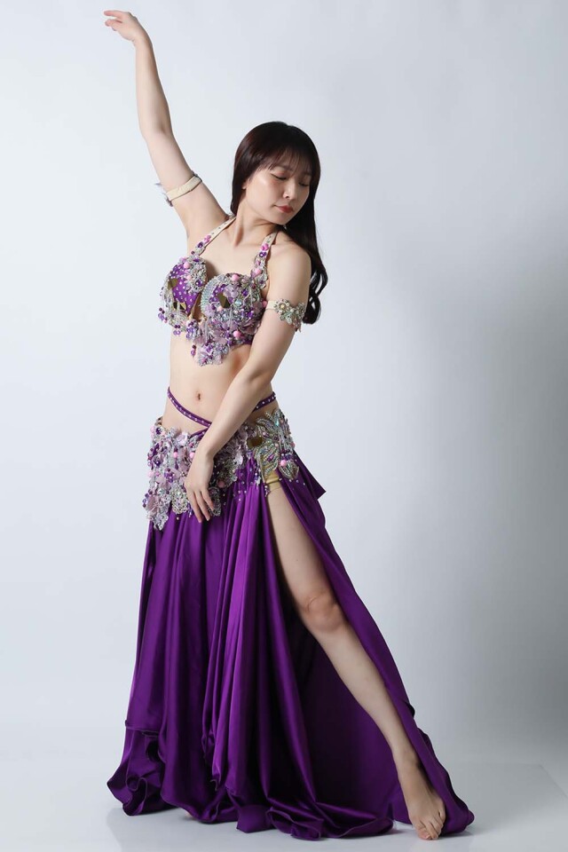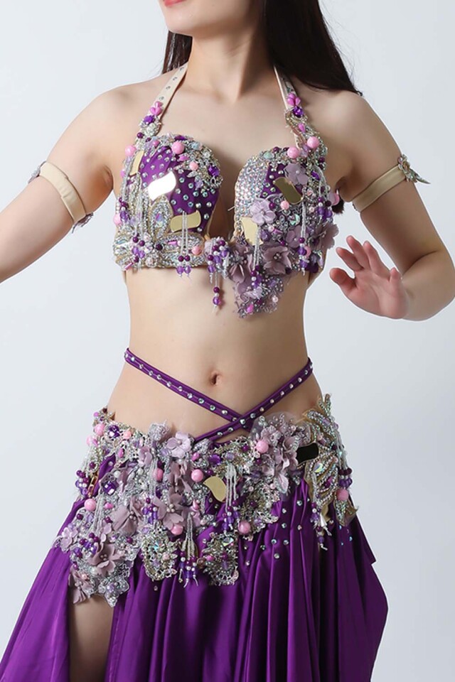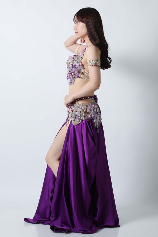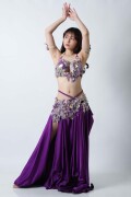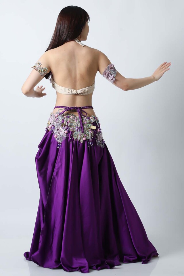 エジプト製デザイナー【Amr】のベリーダンスコスチュームです。鮮やかなパープル単色の衣装です。スカートは光沢のあるサテン生地で縦長ラインを強調してくれるのでスタイル良く見えます。ごちゃごちゃしておらずダンサー自身の個性が引き立つ衣装です。インナーショーツが縫い付けられていますので安心して踊れます。ブラ、スカート、アームバンド(2枚)のセットです。