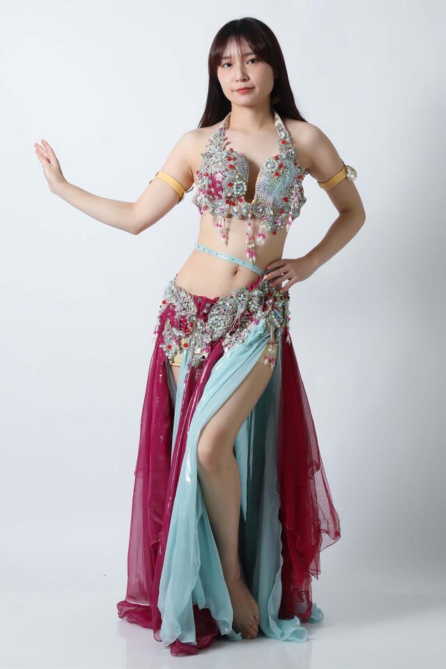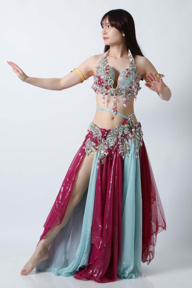| コメント | エジプト製デザイナー【Amr】のベリーダンスコスチュームです。バイオレットとライトブルーの生地を組み合わせた衣装です。大きめのパールモチーフが多数施されていて明るい印象です。軽くて踊りやすいコスチュームです。インナーショーツが縫い付けられていますので安心して踊れます。ブラ、スカート、アームバンド(2枚)のセットです。 こちらの商品は、在庫一点のみとなっております。再入荷の予定も基本的にはございません。 こちらの商品は、ラメが落ちます。ご使用には問題ございません。ご理解、ご了承の上ご購入くださいますようお願い申し上げます。 |