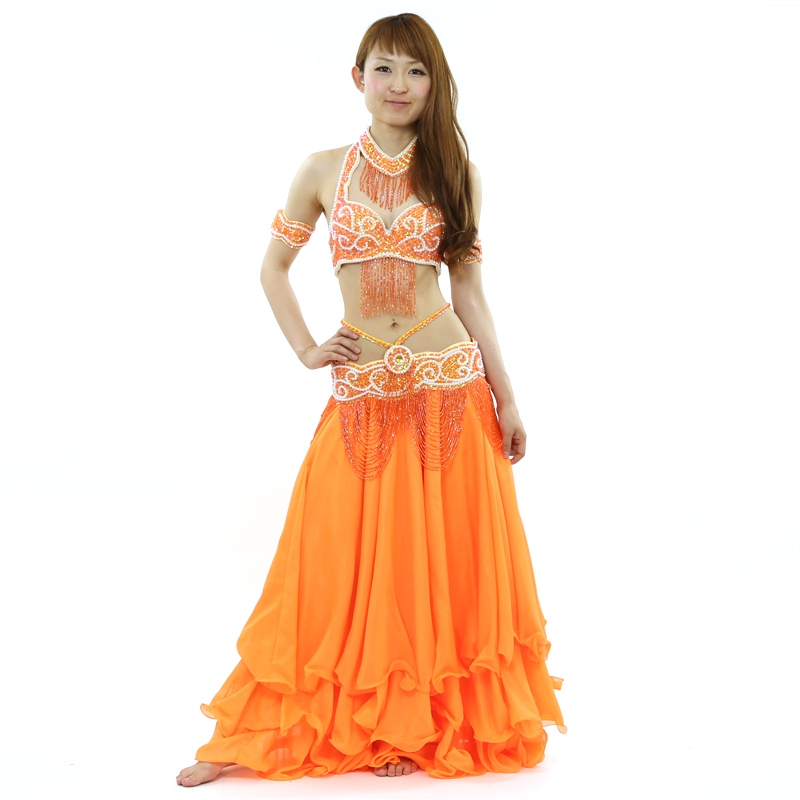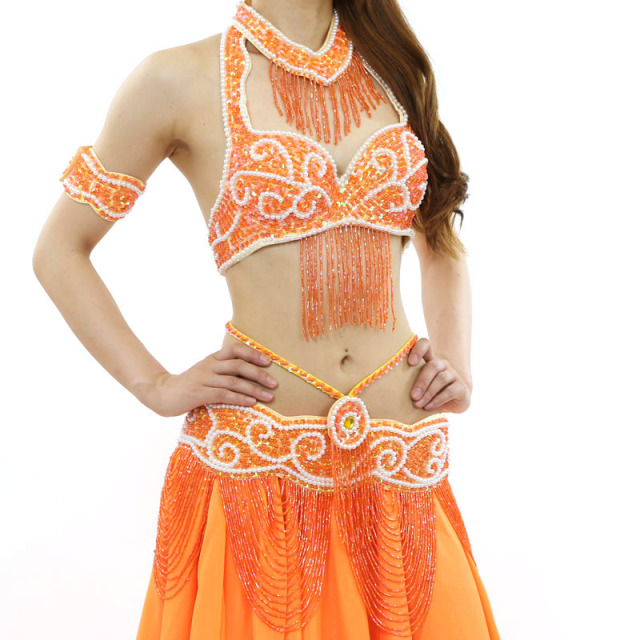 ブラベルトはパールを基調にした気品あるベリーダンス衣装です。アームバンドとネックレスも付いているのでトータルでコーディネートしていただけます。10ヤードに広がる3段のシフォンスカートも豪華です。こちらは明るいオレンジのコスチュームです。
