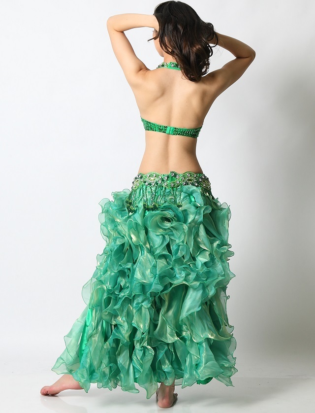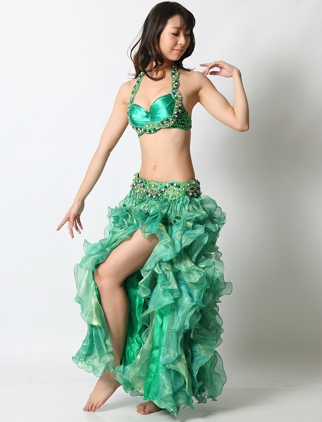 大きめのビジューがたくさん施された緑(グリーン)のコスチュームです。フリルいっぱいのボリューミーなスカートを組み合わせた衣装です。ブラはカップ部分にギャザーを寄せてあるので胸が美しくみえます。