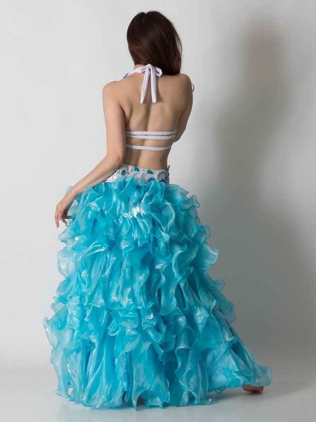ホワイトをベースにライトブルーのビジューが施され可愛らしいイメージです。ブラのバックベルトが3本になっているので締め付けが分散され、バックスタイルをキレイに見せてくれます。お好きなスカートと組み合わせて着用ください。ホワイト、ライトブルー、ブルー系のスカートが合うと思います。スカートはこちらからご購入可能です。