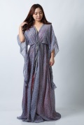 ダンス発表会のコスチュームの上に羽織っていただけるガラベーヤです。スパンコールやビーズで装飾されているデリケートなベリーダンス衣装の保護に最適です。前開きで紐を絞って結ぶタイプですので、衣装に引掛けてしまったり、ヘアスタイルを崩すことなく着脱していただけます。ステージ待ちのときにあると便利な一枚です。こちらはグレーベースに小さい花柄模様のガラベーヤです。