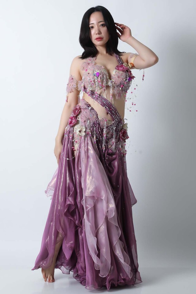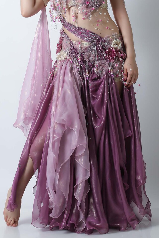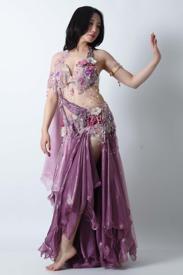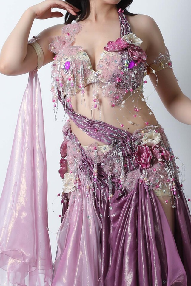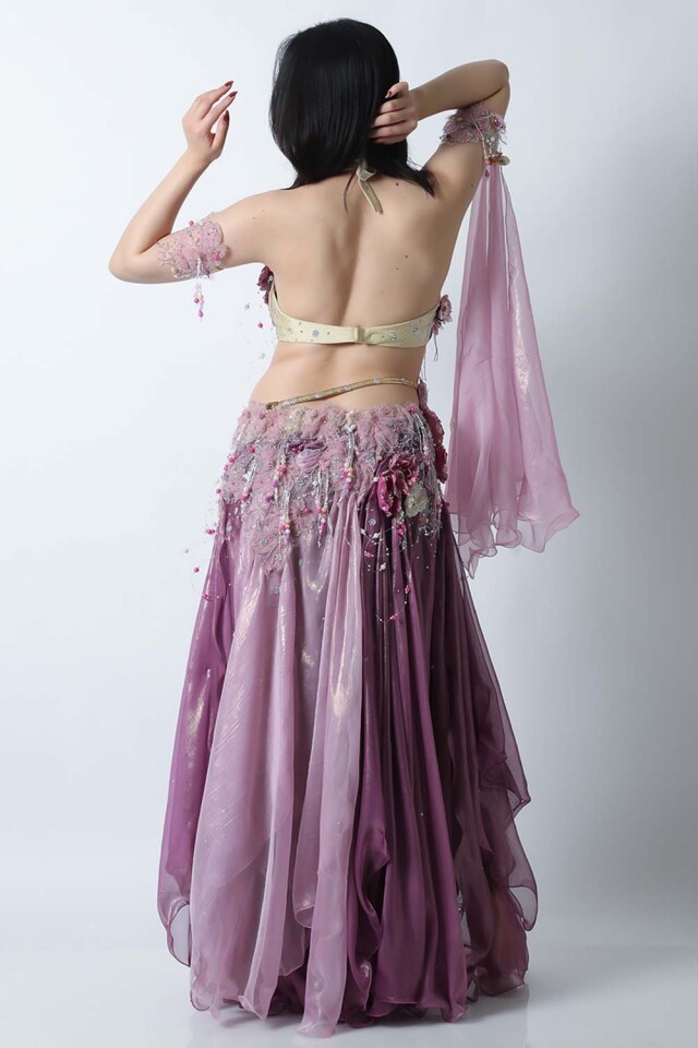 | コメント | 人気のデザイナーHoydaのエジプト製ベリーダンスコスチュームです。パープルとピンクの生地を組み合わせた衣装です。大きめのコサージュが多数施されており立体感があります。テグスに通したパールモチーフの装飾も動きがありゴージャス感溢れるコスチュームです。スカートはインナーショーツも縫い付けられていますので安心です。ブラ、スカート、アームバンド(2本)のセットです。 こちらの商品は、在庫一点のみとなっております。再入荷の予定も基本的にはございません。 |