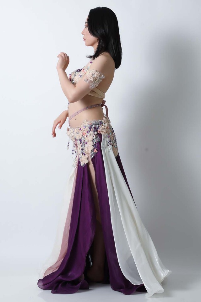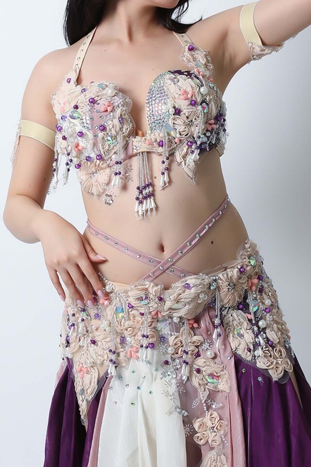 | コメント | エジプト製デザイナー【Amr】のベリーダンスコスチュームです。パープル、ホワイト、ピンクの生地を組み合わせた衣装です。全体的に上品な印象のコスチュームです。インナーショーツが縫い付けられていますので安心して踊れます。ブラ、スカート、アームバンド(2枚)のセットです。 こちらの商品は、在庫一点のみとなっております。再入荷の予定も基本的にはございません。 |