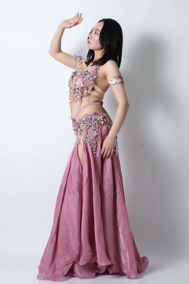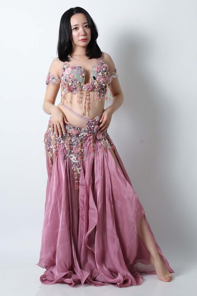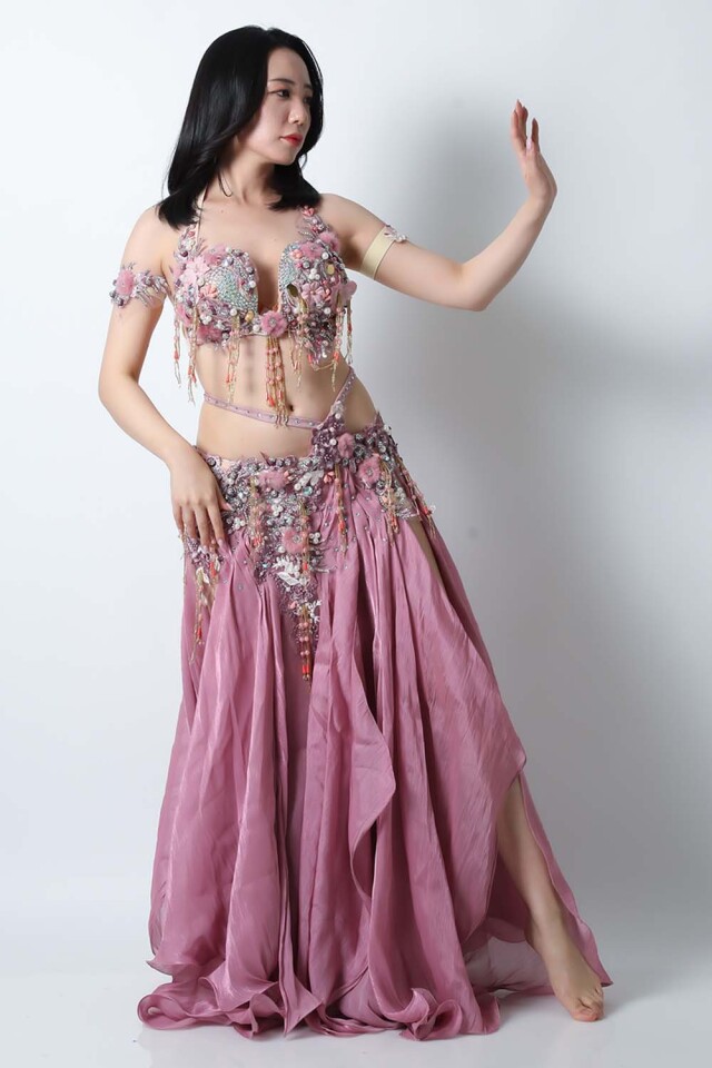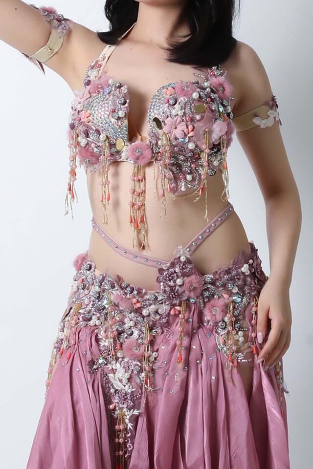 | コメント | エジプト製デザイナー【Amr】のベリーダンスコスチュームです。ピンク単色の衣装ですのでベールなどの小物ともコーディネートしやすいです。パールモチーフや立体感のある可愛らしい装飾が多数施されております。インナーショーツが縫い付けられていますので安心して踊れます。ブラ、スカート、アームバンド(2枚)のセットです。 こちらの商品は、在庫一点のみとなっております。再入荷の予定も基本的にはございません。 |