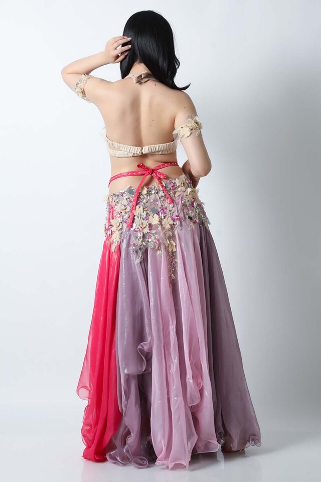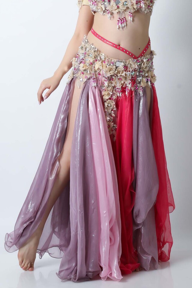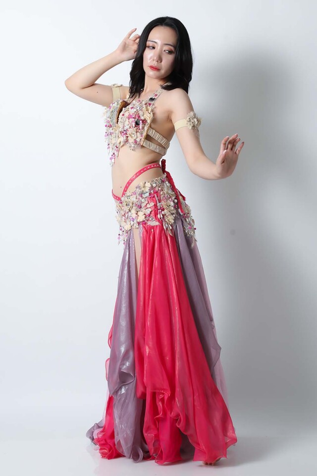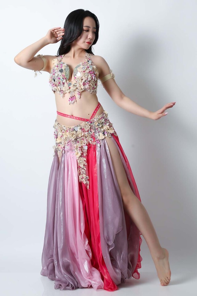 | コメント | エジプト製デザイナー【Amr】のベリーダンスコスチュームです。フーシャ、ピンク、ラベンダーの生地を組み合わせた衣装です。パールモチーフの装飾が多数施されております。ハート型のミラーモチーフが可愛らしいコスチュームです。インナーショーツが縫い付けられていますので安心して踊れます。ブラ、スカート、アームバンド(2枚)のセットです。 こちらの商品は、在庫一点のみとなっております。再入荷の予定も基本的にはございません。 |