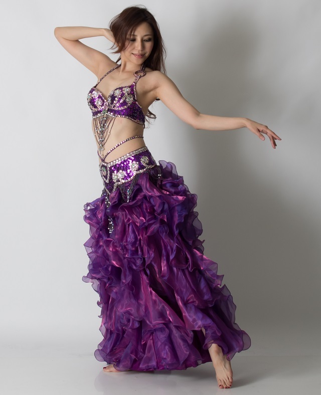 | コメント | ベリーダンスの発表会、イベント用の衣装です。ブラベルトは中心に大きなビジューがあるデザインのため引き締まって見えます。スカートはフリルがたくさん付いてボリュームもあり、大胆なスリットがベリーらしさを出しています。こちらは華やかな紫(パープル)のコスチュームです。 |